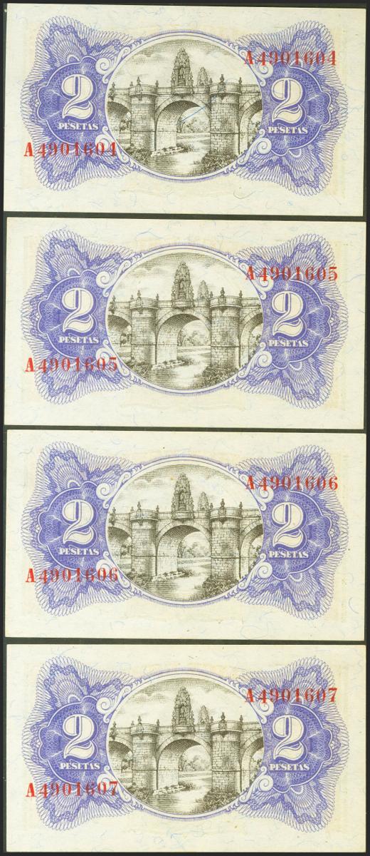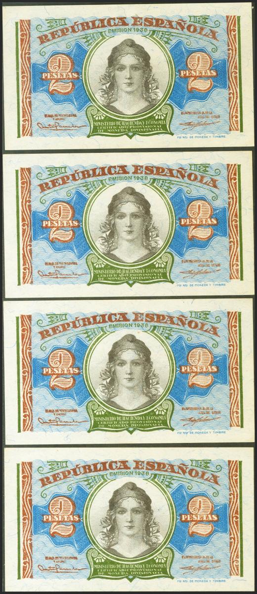 English 2 pesetas. 1938. Ministry of Finance. Four correlative banknotes. Series A. (Edifil 2021: 393). Original sizing. Uncirculated.