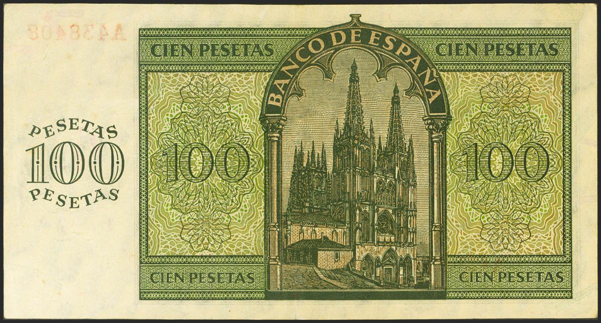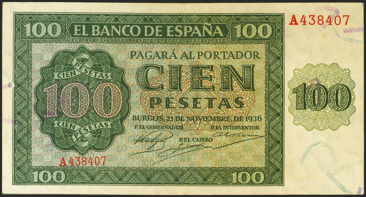 100 pesetas. November 21, 1936. Series A. (Edifil 2021: 421). It retains part of its original sizing. Extremely Fine.