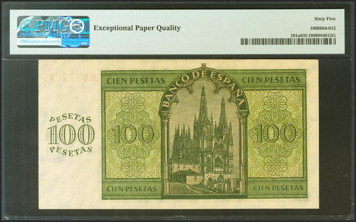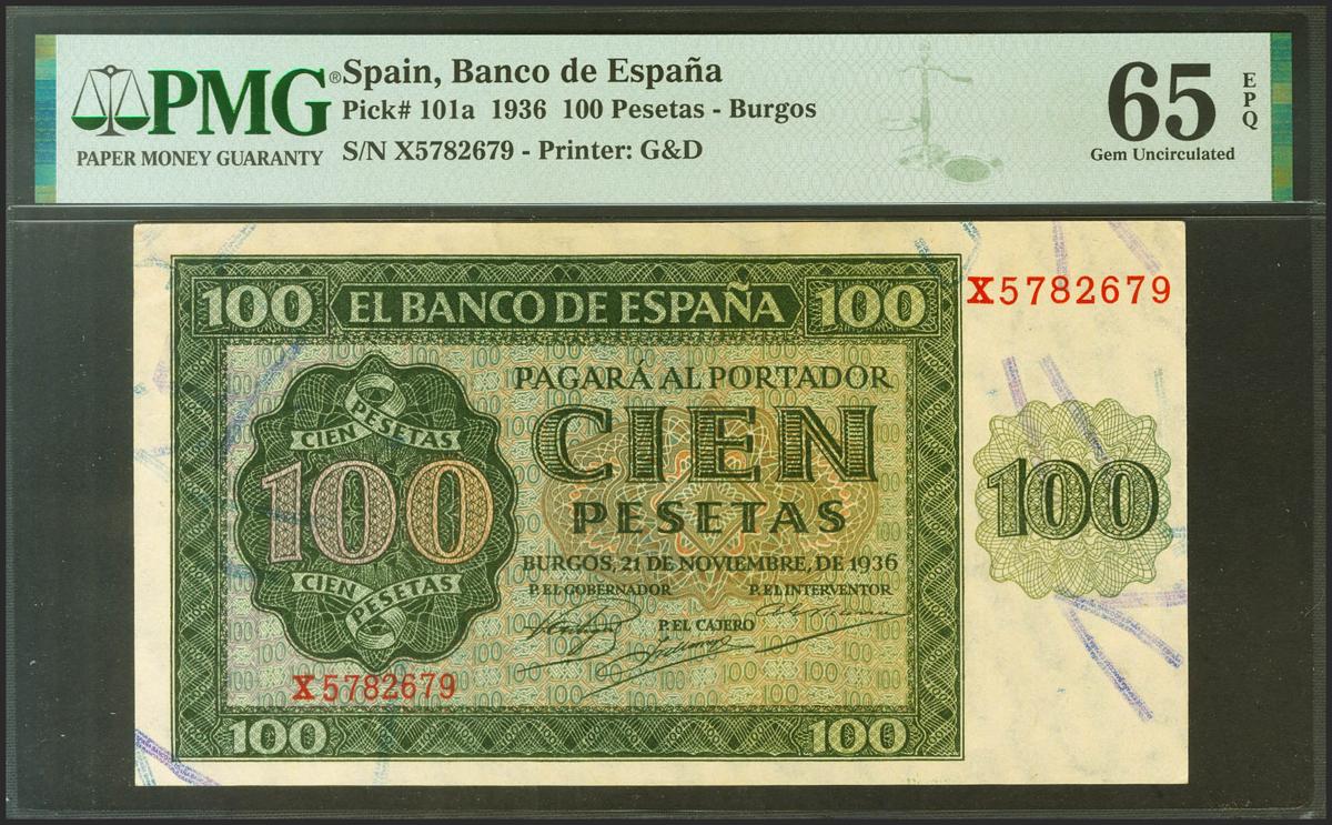 English 100 pesetas. November 21, 1936. Series X, last series. (Edifil 2021: 421a, Pick: 101a). Rare in this quality, original sizing. Uncirculated. PMG65EPQ package.