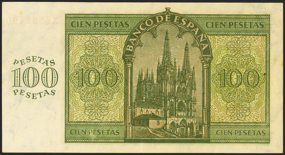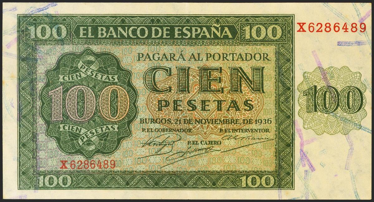 100 pesetas. November 21, 1936. Series X, last series issued. (Edifil 2021: 421a). Retains part of the original sizing. Good Extremely Fine.