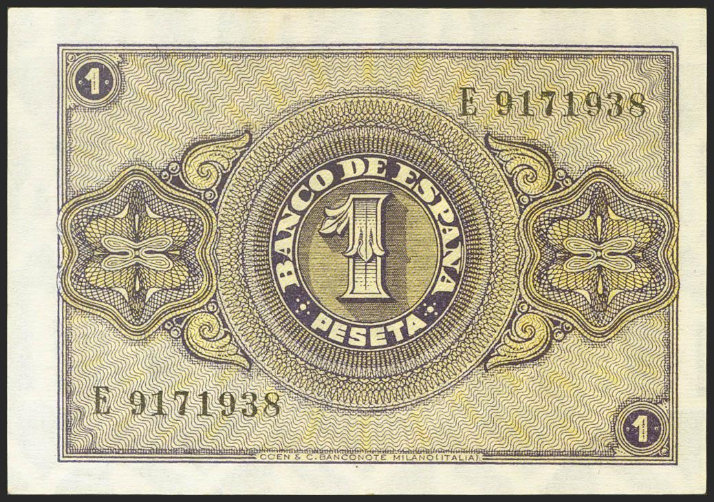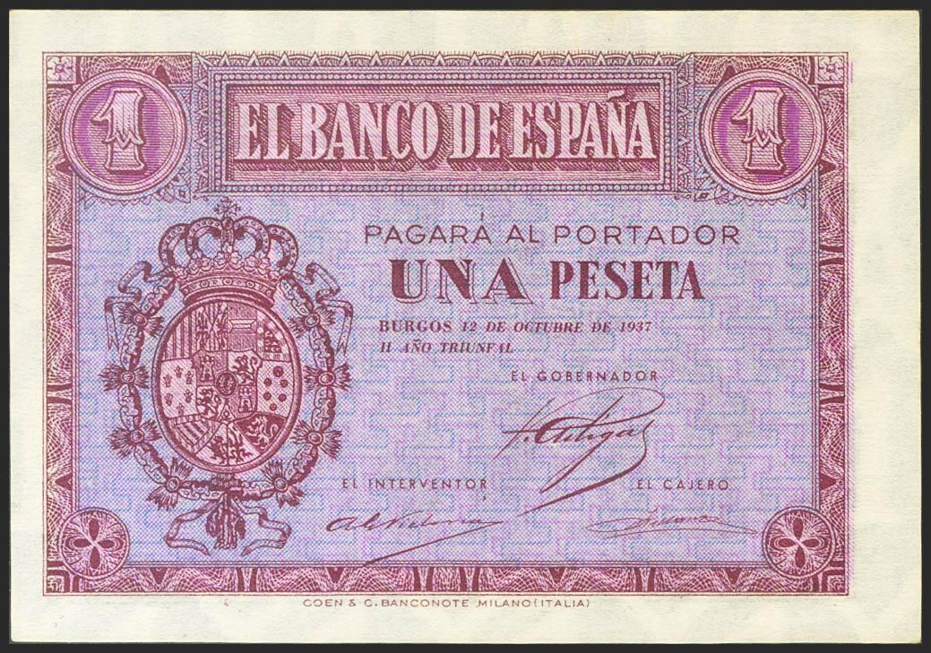 1 Peseta. October 12, 1937. Series E. (Edifil 2021: 425a). Original sizing. Almost Uncirculated.