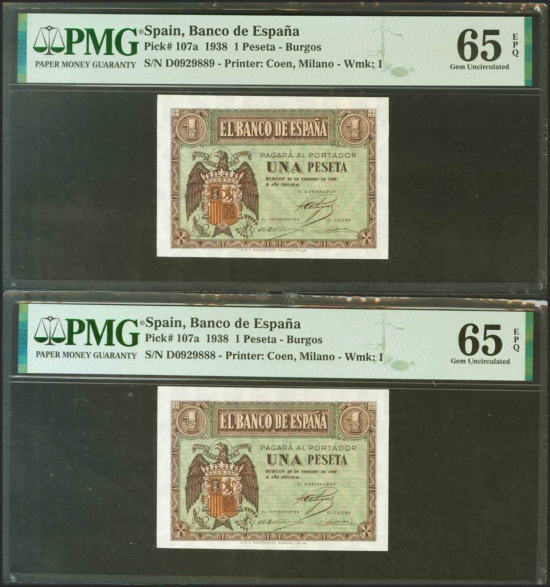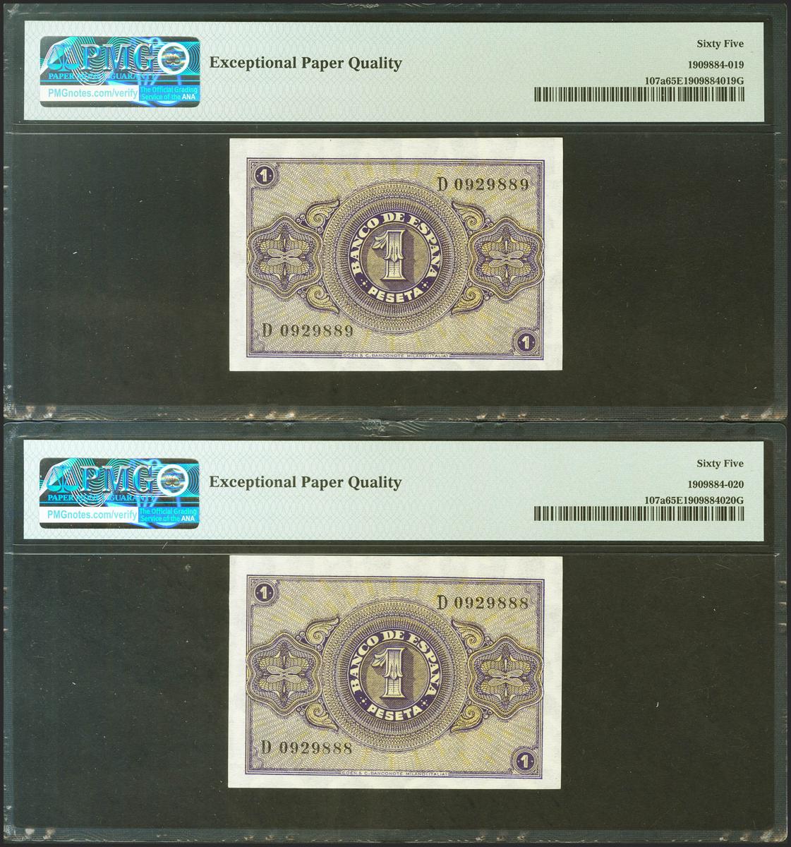 1 Peseta. February 28, 1938. Correlative couple. Series D. (Edifil 2021: 427a, Pick: 107a). Rare in this quality, original sizing. Uncirculated. PMG65EPQ package, both.