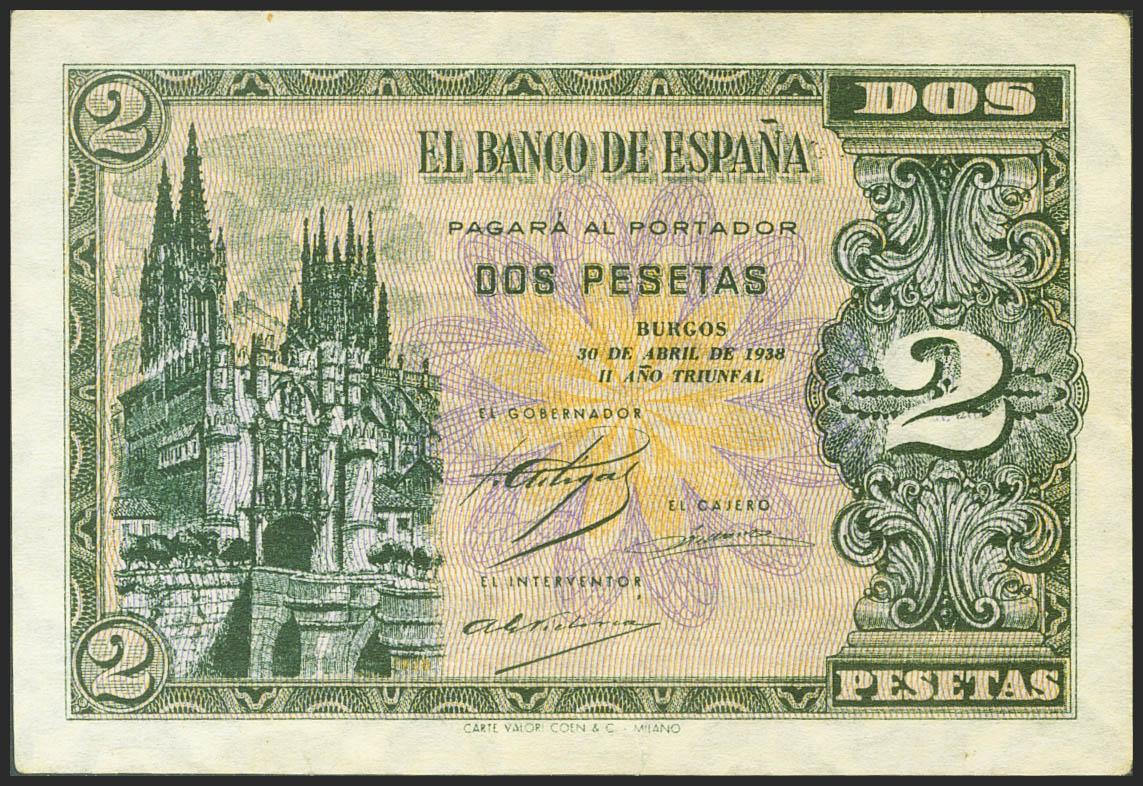 2 pesetas. April 30, 1938. Series A. (Edifil 2021: 429). Original sizing. Almost Uncirculated-.