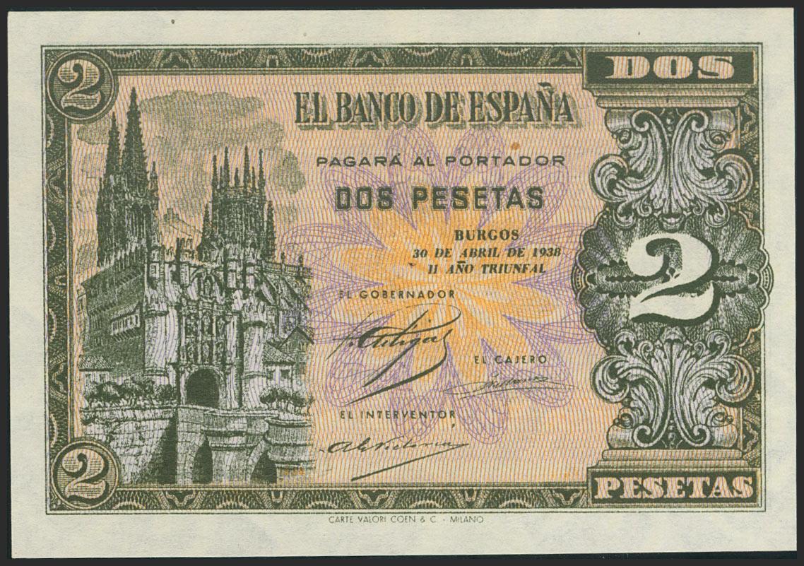 2 pesetas. April 30, 1938. Series C. (Edifil 2021: 429a). Original sizing. Uncirculated.