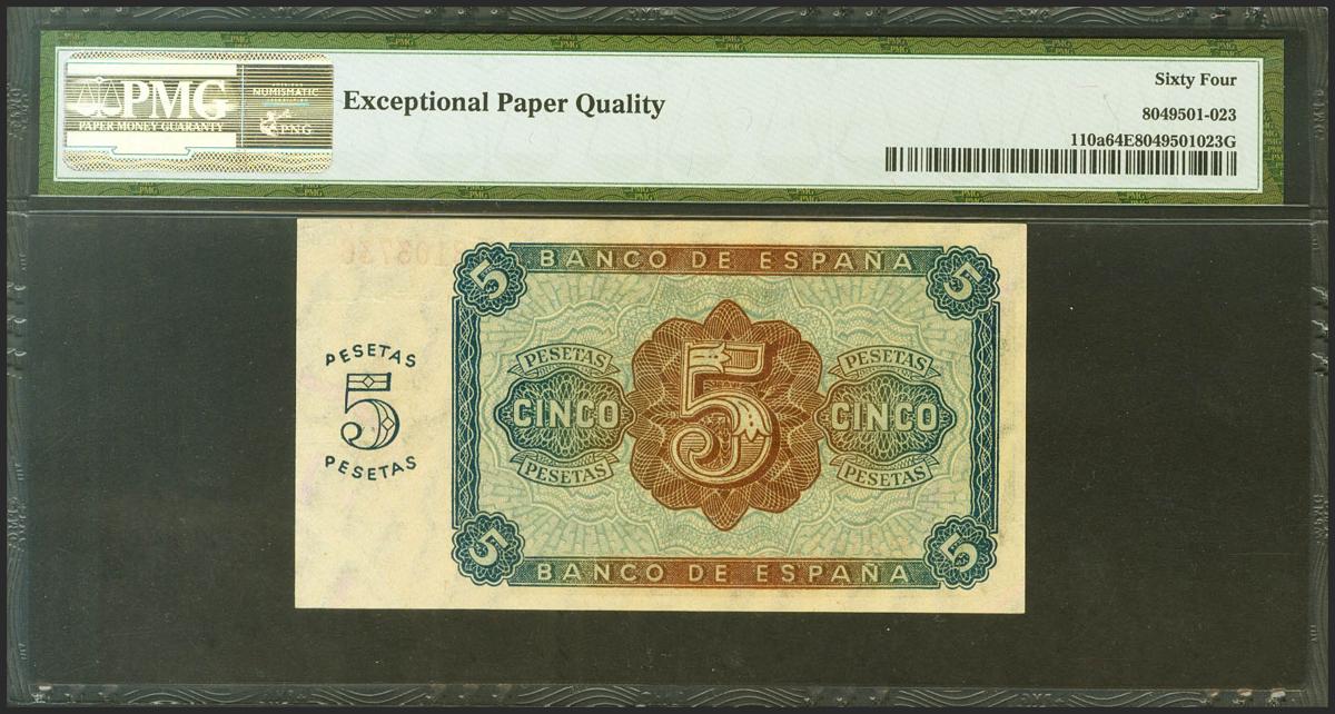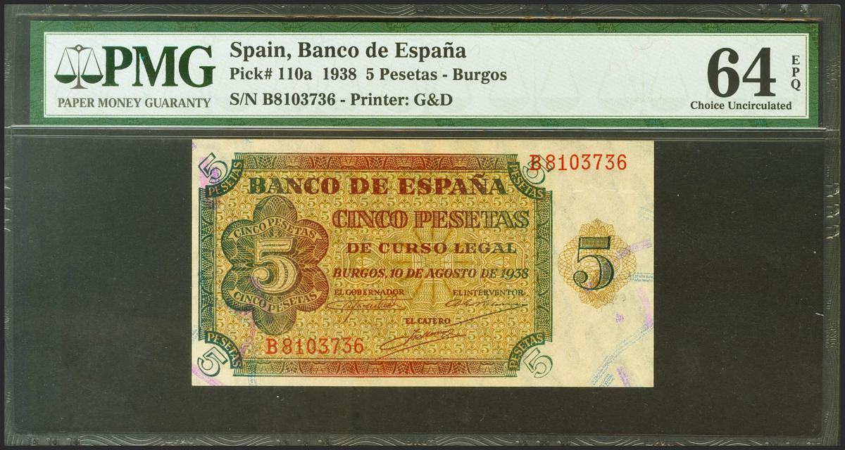 5 pesetas. August 10, 1938. Series B. (Edifil 2021: 435a, Pick: 110a). Original sizing. PMG65EPQ package.