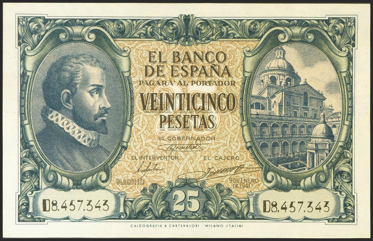 25 pesetas. January 9, 1940. Series D. (Edifil 2021: 436a). Unusual in this quality, it retains all its original sizing. Good Extremely Fine.