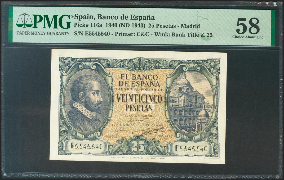 25 pesetas. January 9, 1940. Series E. (Edifil 2021: 436a, Pick: 116a). EBC++. PMG58 encapsulation.