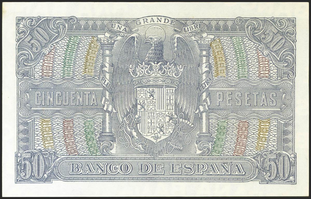 English 50 pesetas. January 9, 1940. Series D. (Edifil 2021: 437a). Very rare in this superlative quality, it retains all its original sizing. Uncirculated.