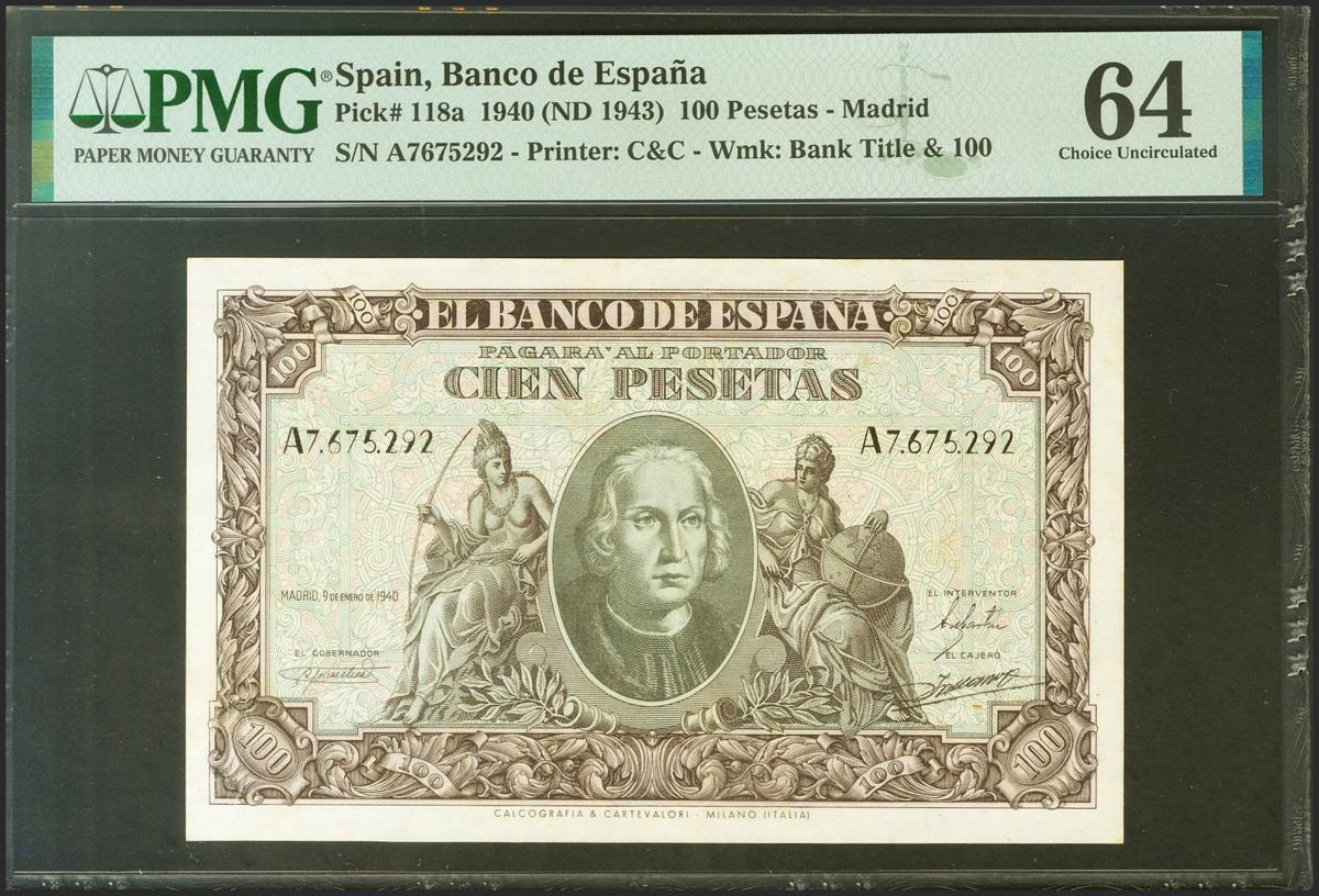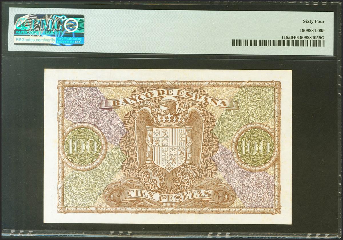 100 pesetas. January 9, 1940. Series A. (Edifil 2021: 438, Pick: 118a). Unusual in this quality. Uncirculated. PMG64 package.