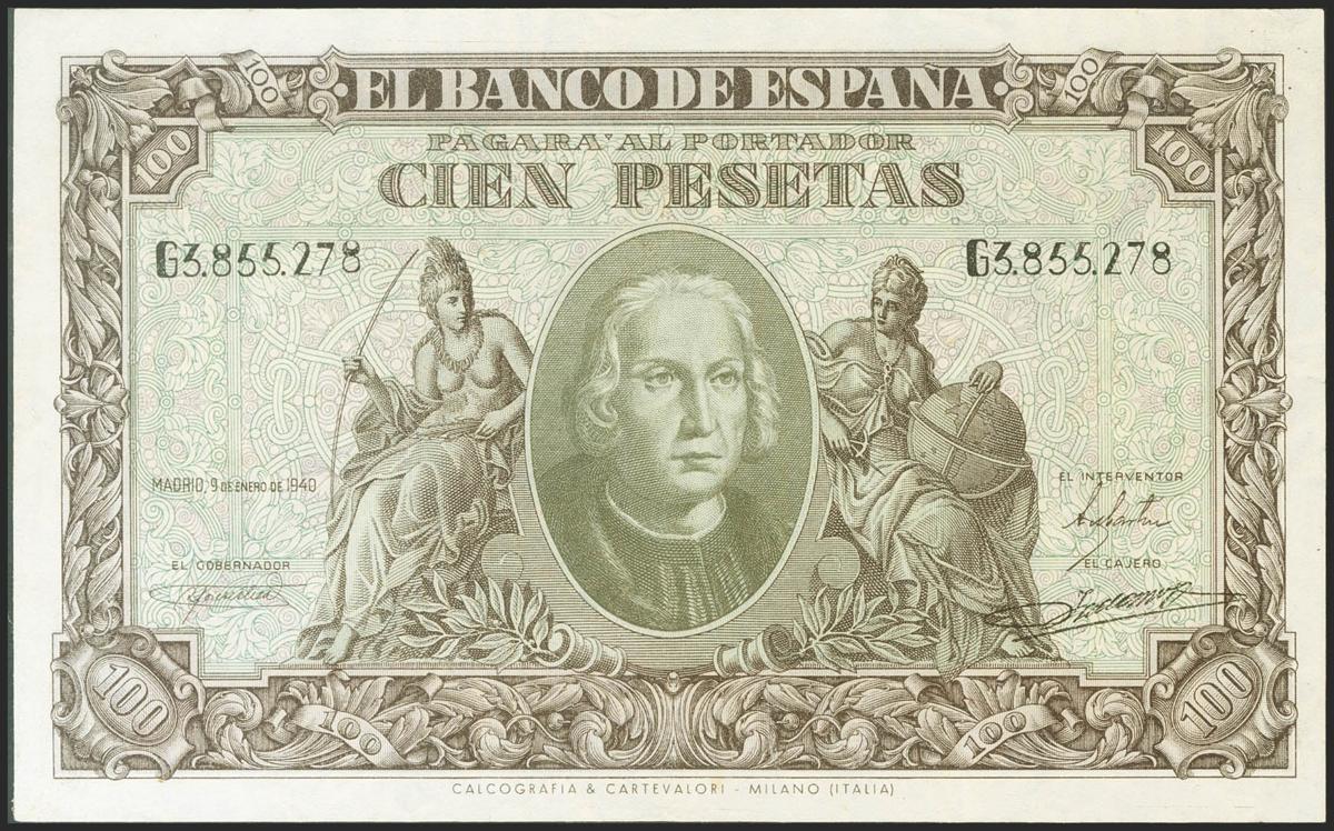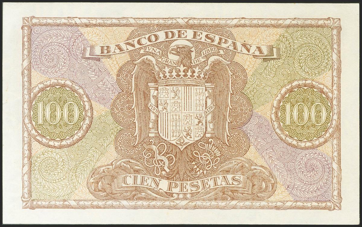 100 pesetas. January 9, 1940. Series G. (Edifil 2021: 438a). Retains part of the original sizing. Extremely Fine.