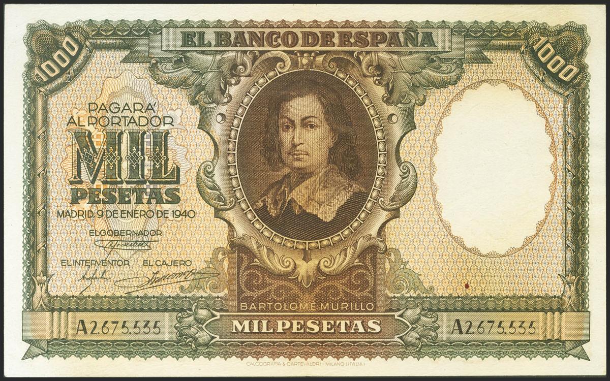 1000 Pesetas. January 9, 1940. Series A. (Edifil 2021: 440). Retains part of the original sizing. Extremely Fine.
