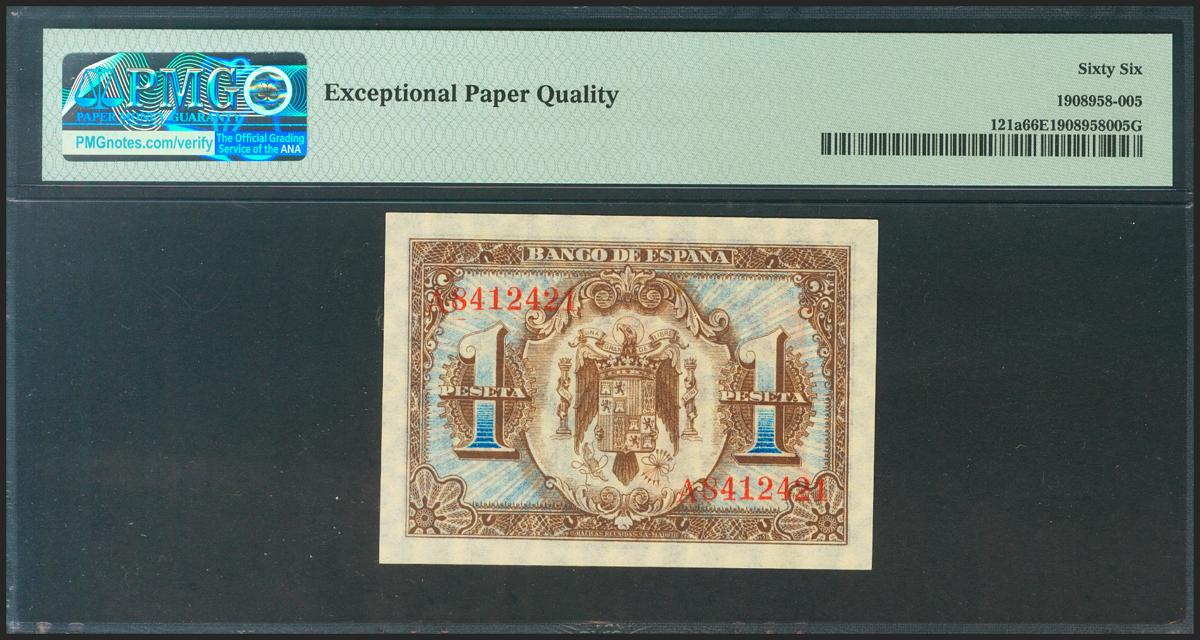 1 Pesetas. June 1, 1940. Series A. (Edifil 2021: 441a, Pick: 121a). Rare in this quality, original sizing. Uncirculated. PMG66EPQ package.