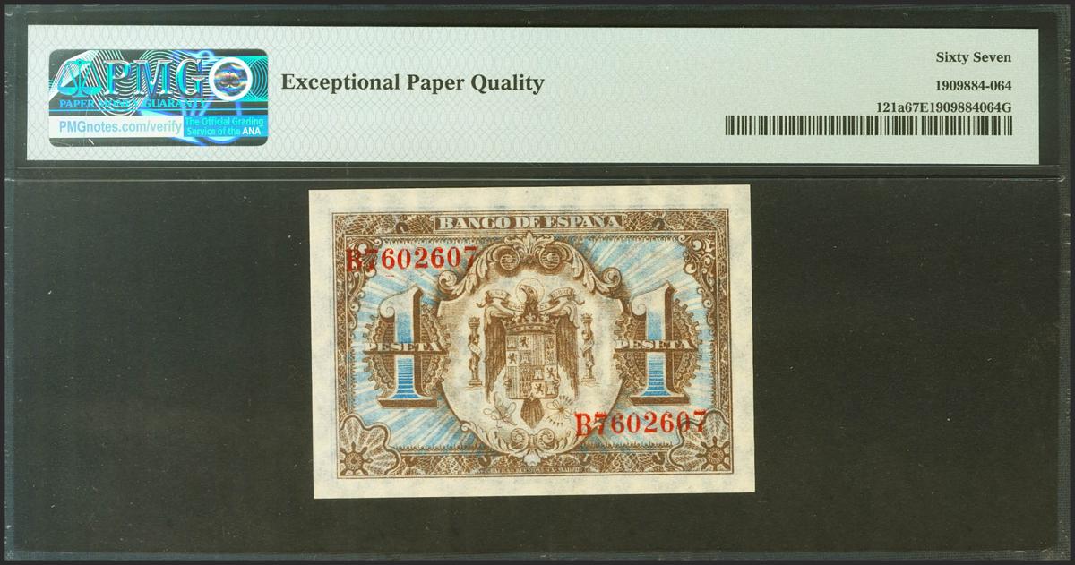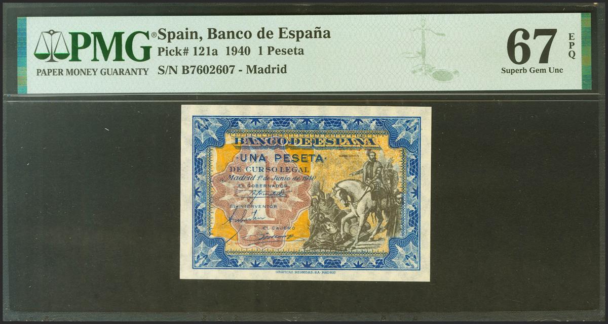 English 1 Peseta. June 1, 1940. Series B. (Edifil 2021: 441a, Pick: 121a). Rare in this exceptional quality, original sizing. Uncirculated. PMG67EPQ package.
