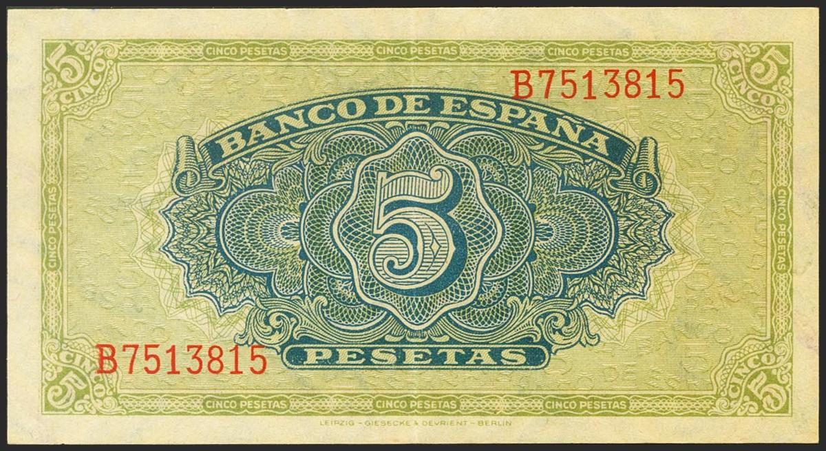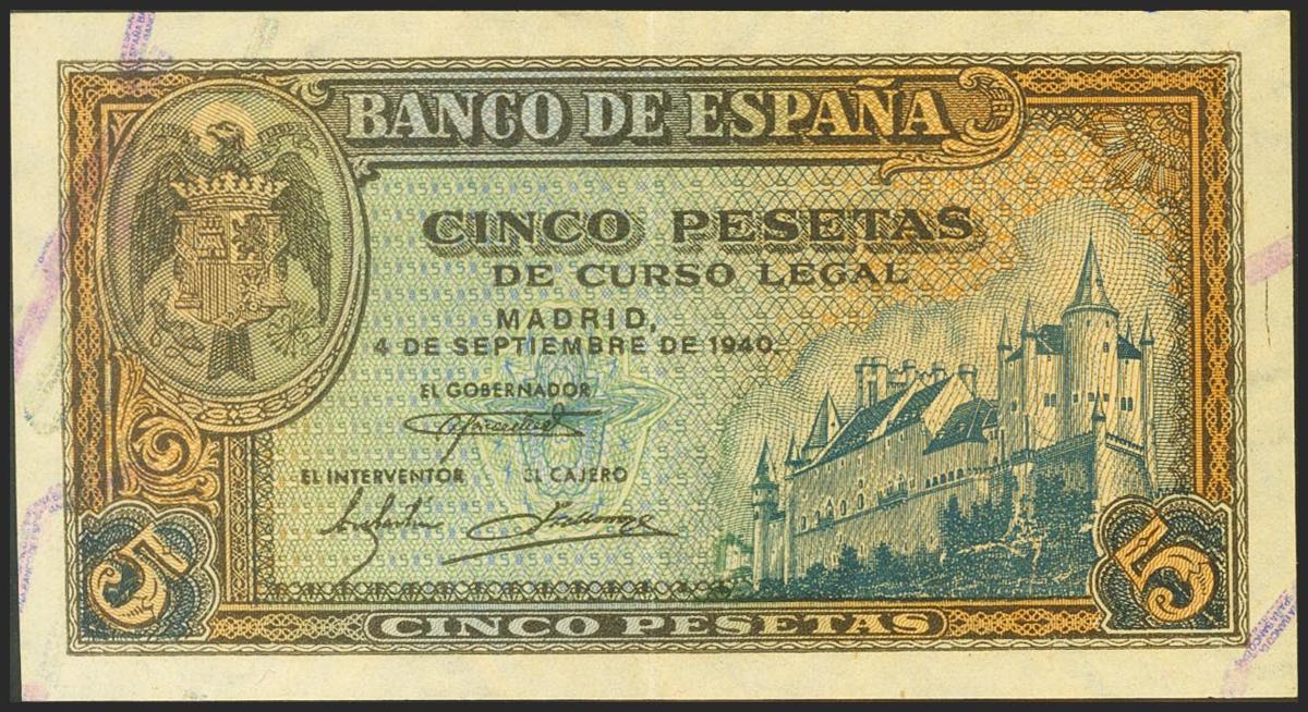 5 pesetas. September 4, 1940. Series B. (Edifil 2021: 443a). Original sizing. Good Extremely Fine.