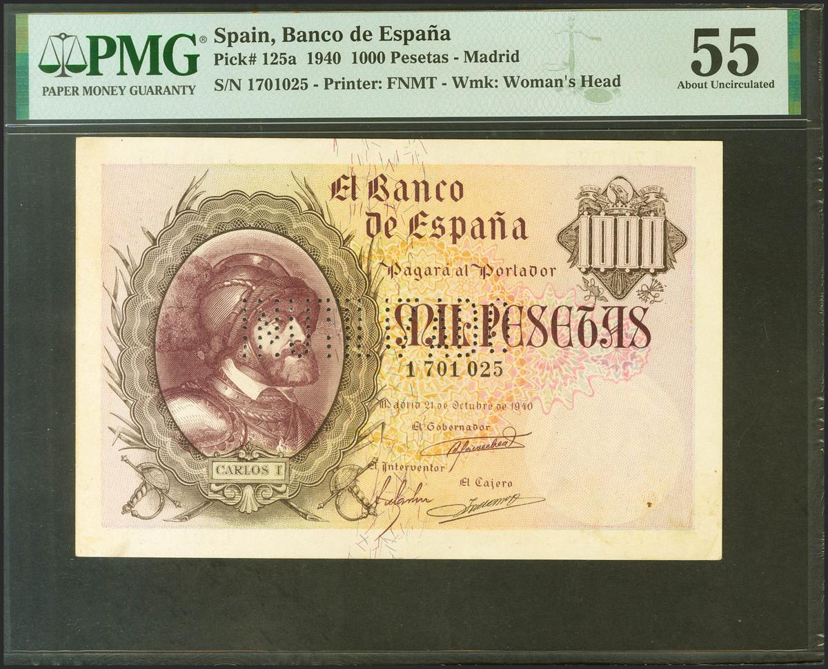 1000 Pesetas. October 21, 1940. DISABLED, drilling. No serie. (Edifil 2021: 445N). Good Extremely Fine. PMG55 encapsulation.