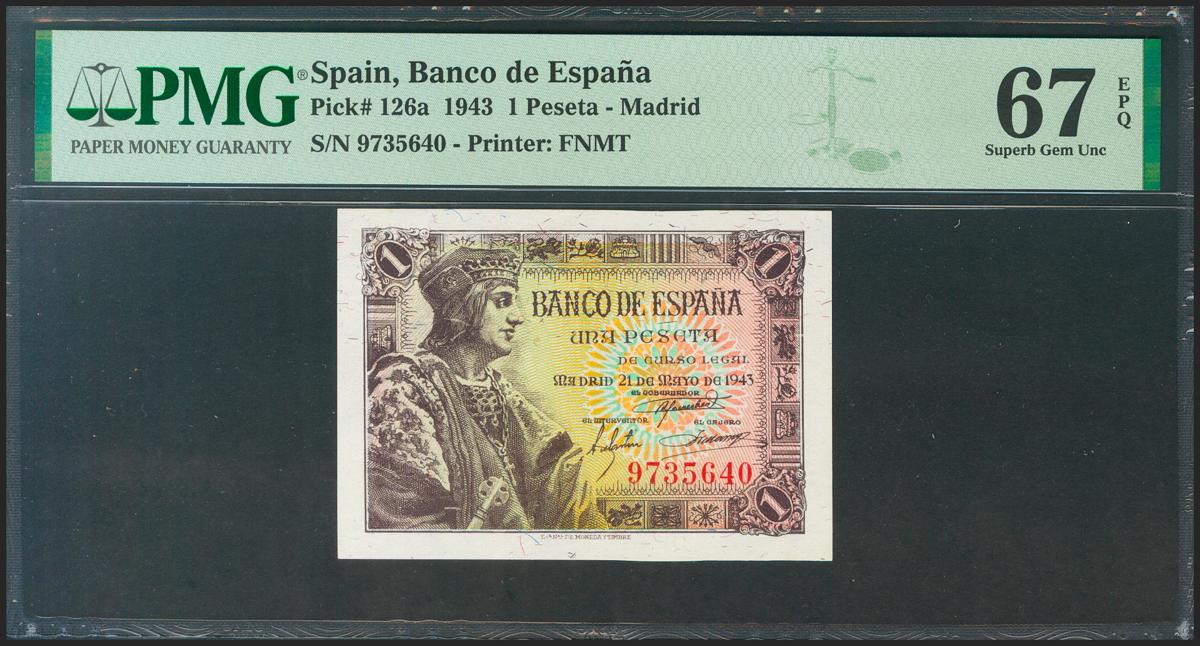 1 Pesetas. May 21, 1943. No series. (Edifil 2021: 447, Pick: 126a). Rare in this quality, original sizing. Uncirculated. PMG67EPQ package.