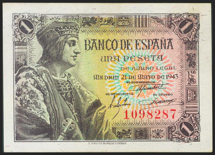 1 Peseta. May 21, 1943. No series. (Edifil 2021: 447). Retains much of the original sizing. Good Extremely Fine.