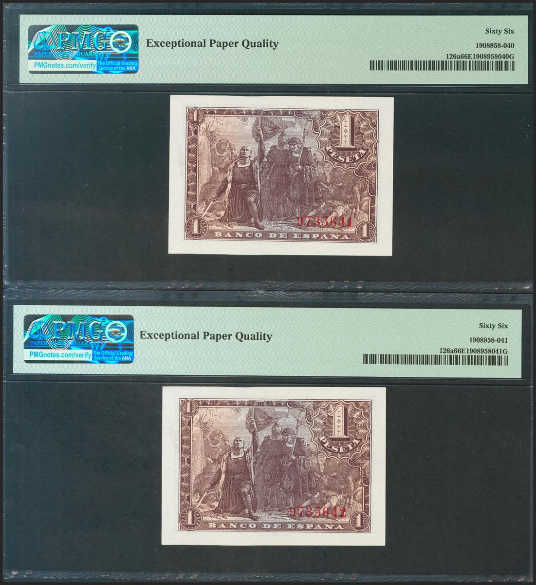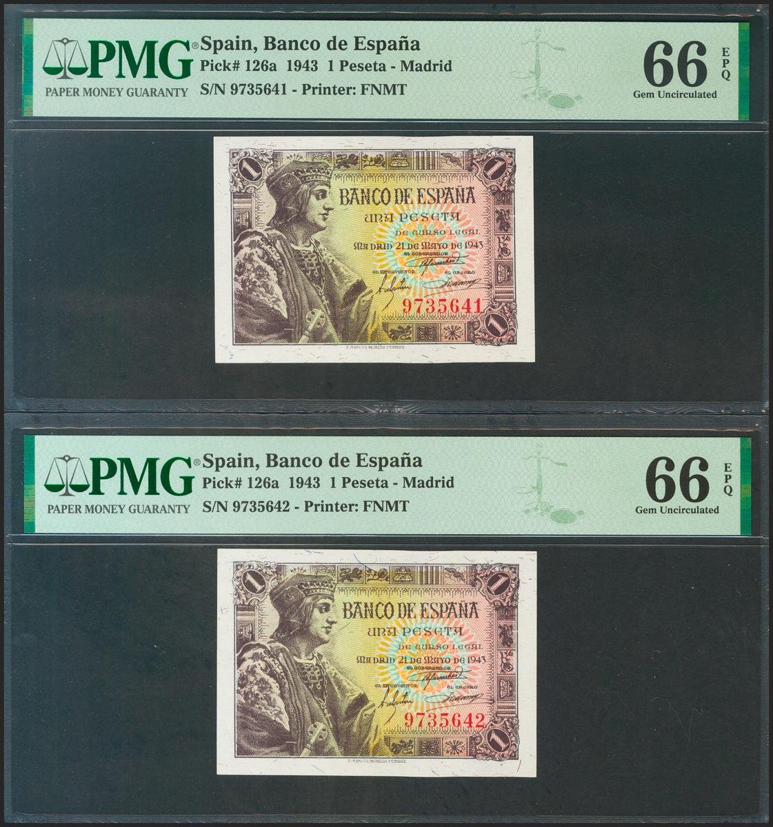 1 Pesetas. May 21, 1943. Correlative couple. No serie. (Edifil 2021: 447, Pick: 126a). Rare in this quality, original sizing. Uncirculated. PMG66EPQ package, both.
