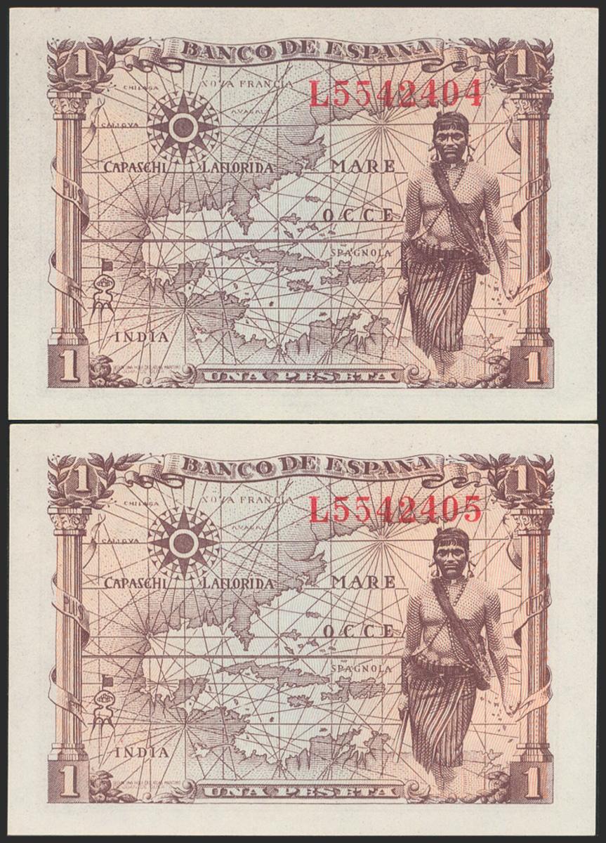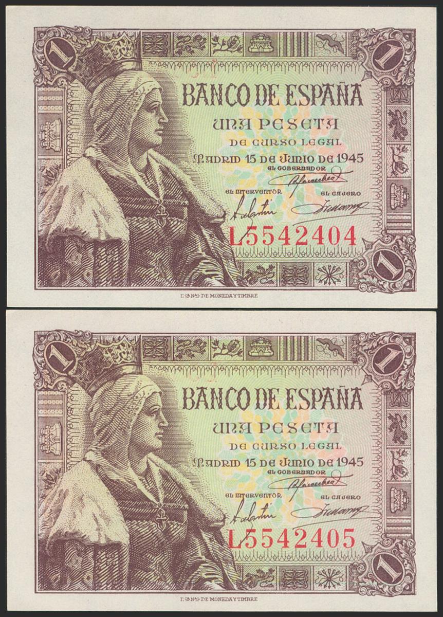 1 Peseta. June 15, 1945. Correlative couple. Series L. (Edifil 2021: 448a). Original sizing. Uncirculated.