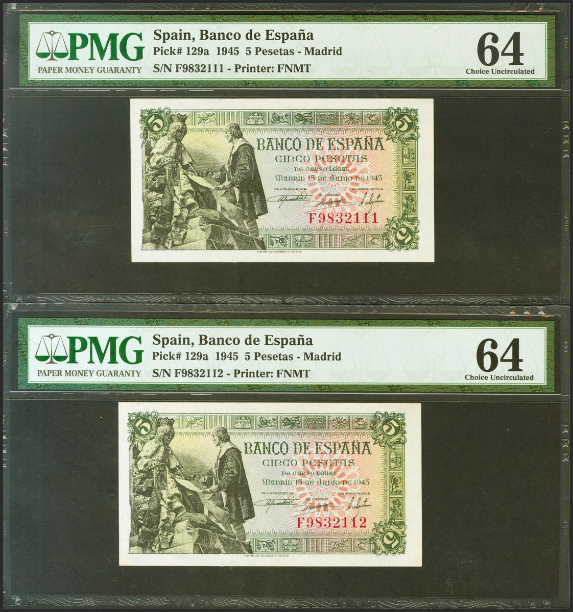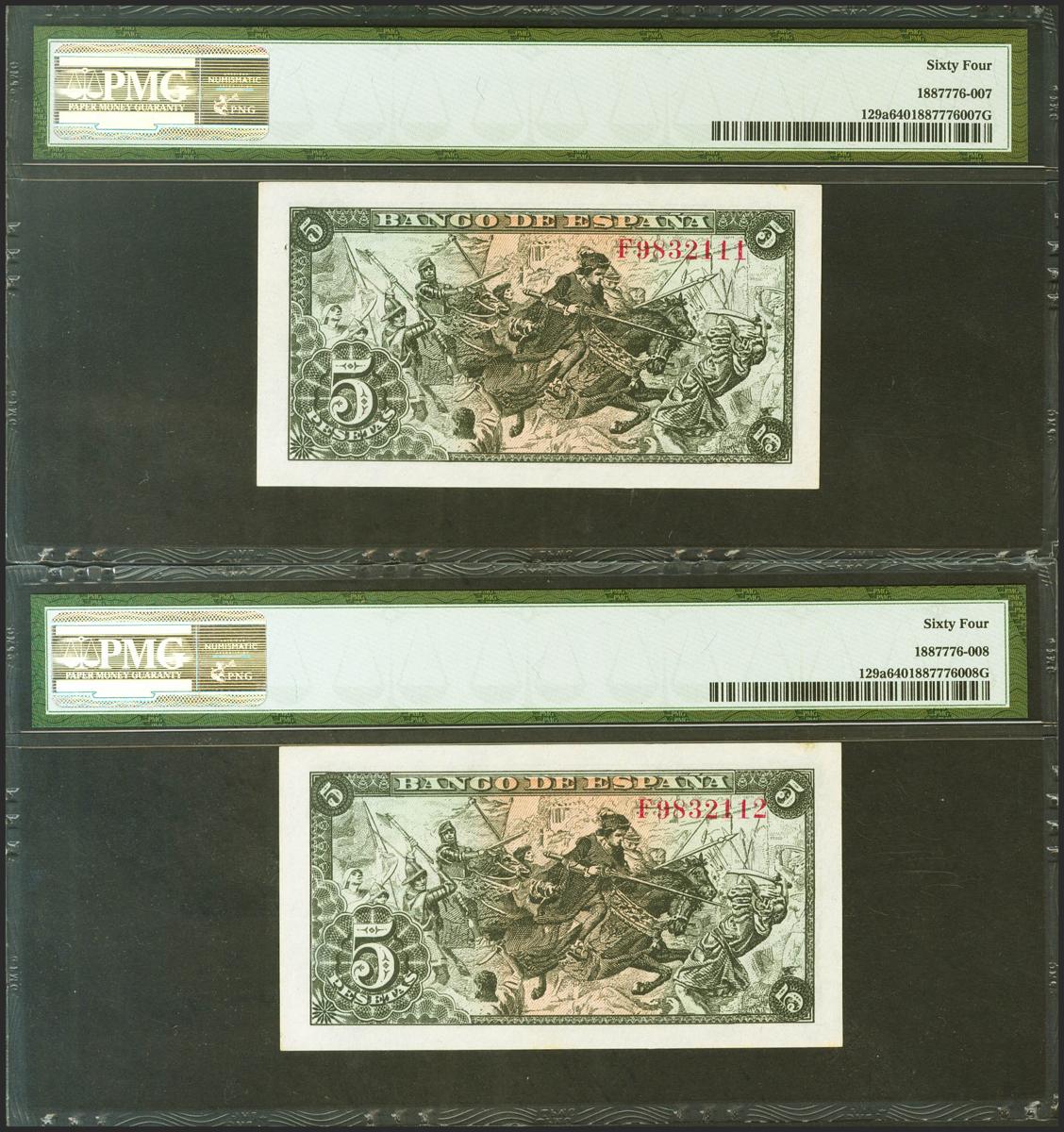 5 pesetas. June 15, 1945. Correlative couple. Series F. (Edifil 2021: 449a, Pick: 129a). Uncirculated. PMG64 packages, both.