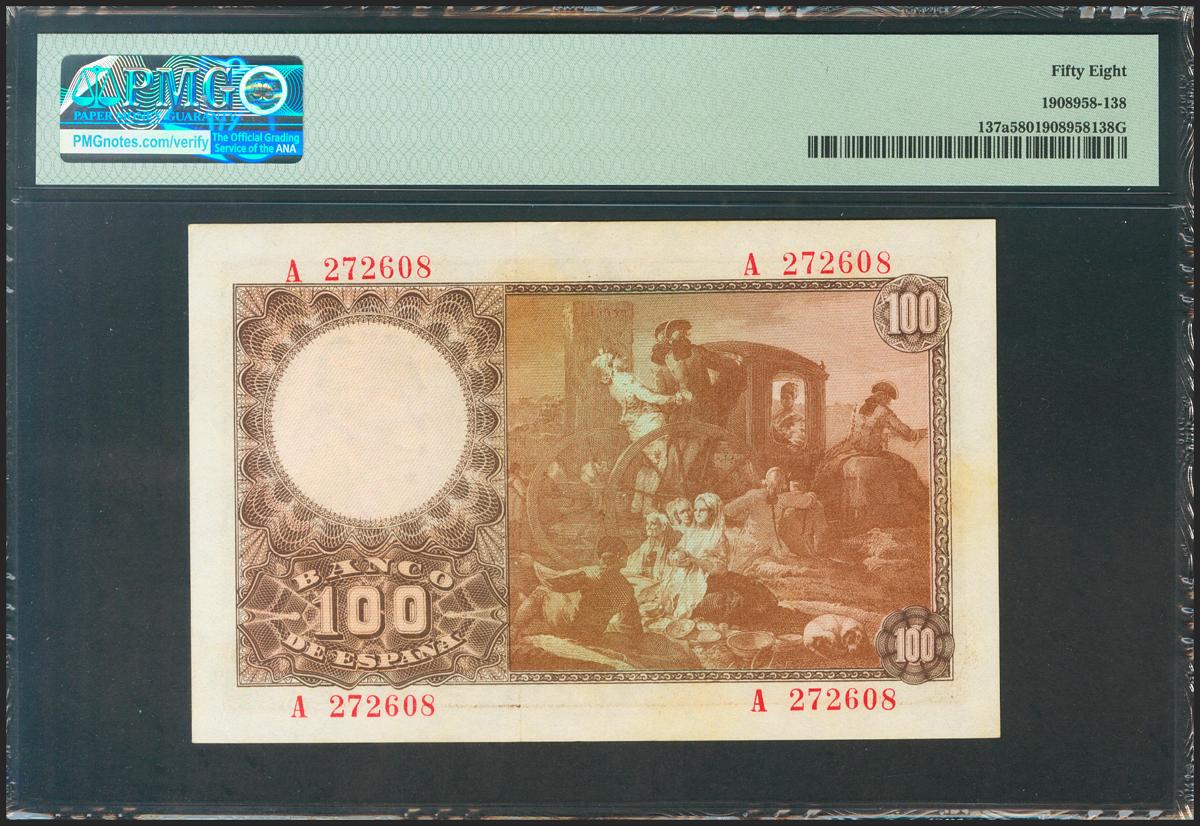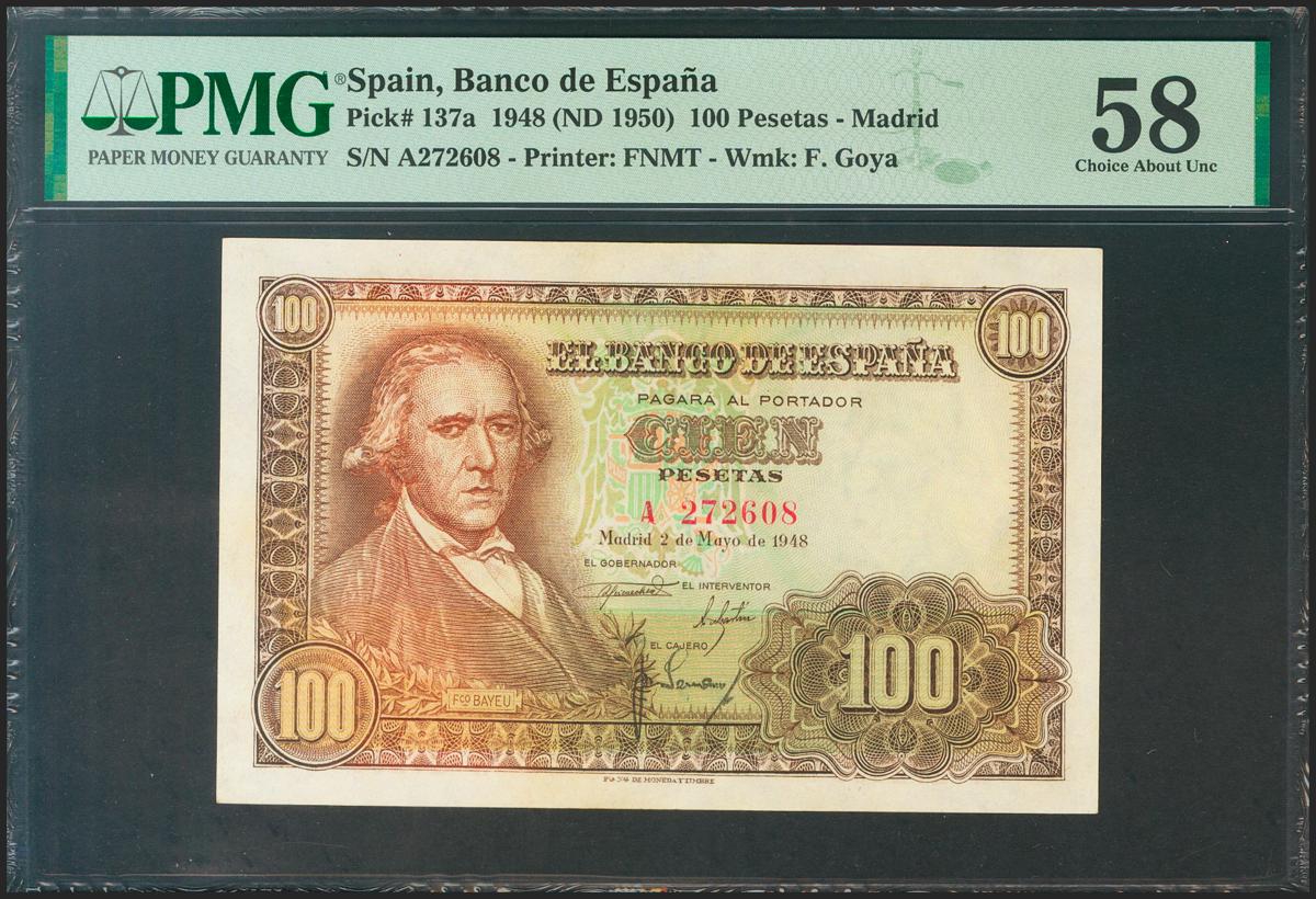 100 pesetas. May 2, 1948. Series A. (Edifil 2021: 456a, Pick: 137a). Unusual in this quality. EBC++. PMG58 encapsulation.