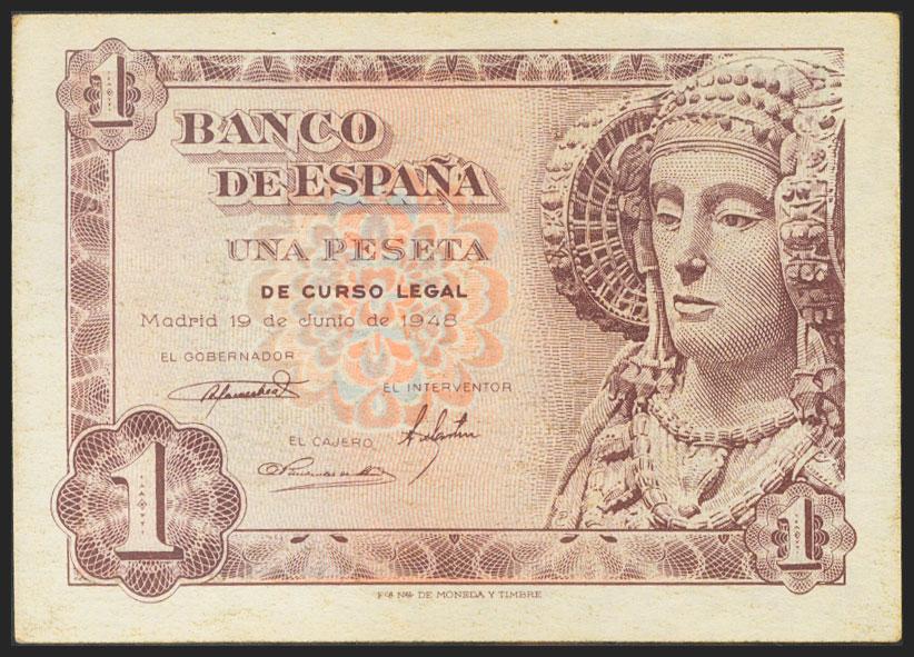 1 Peseta. June 19, 1948. Series Ñ, only exists on this note. (Edifil 2021: 457a). Original sizing. Almost Uncirculated-.