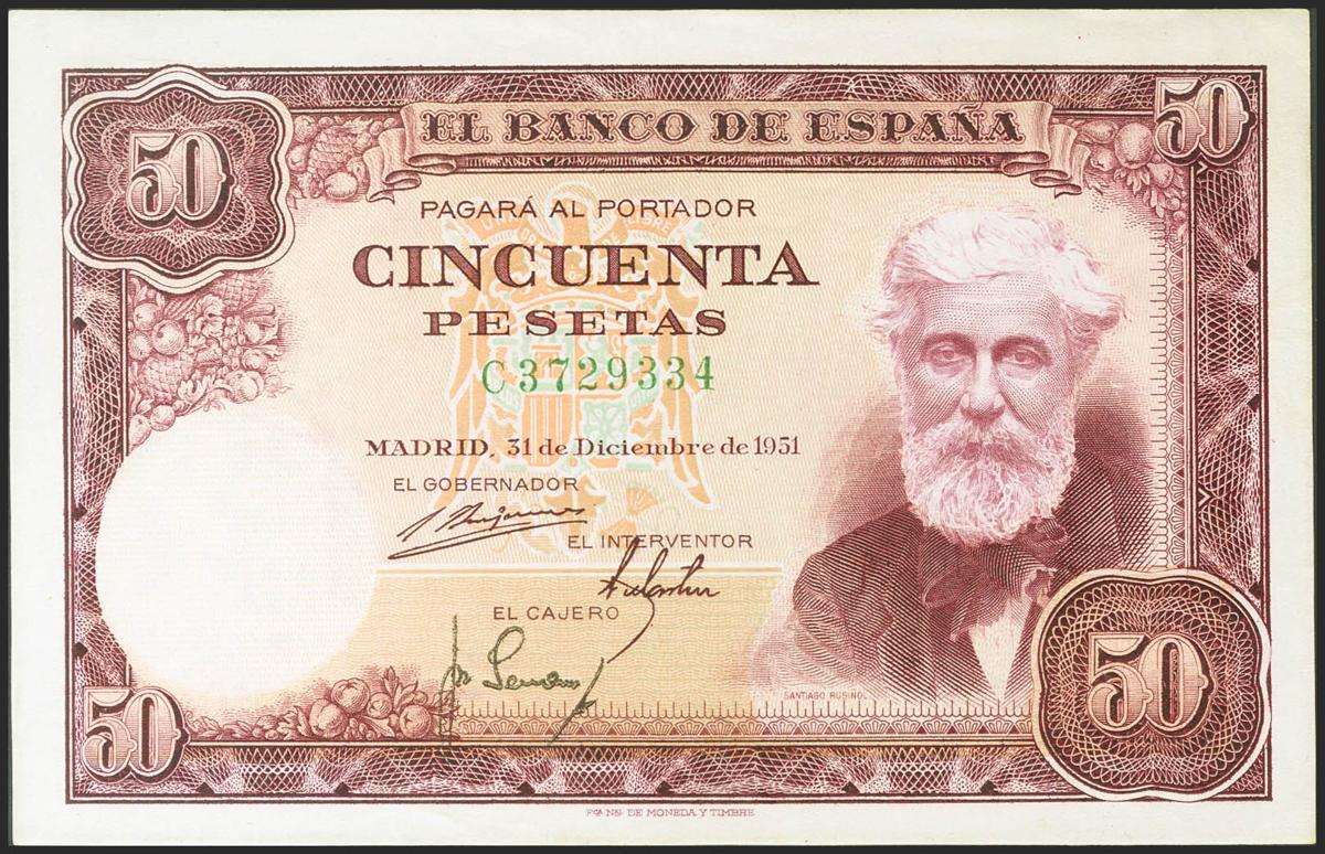 50 pesetas. December 31, 1951. Series C. (Edifil 2021: 462a). It retains all its original sizing. Almost Uncirculated.