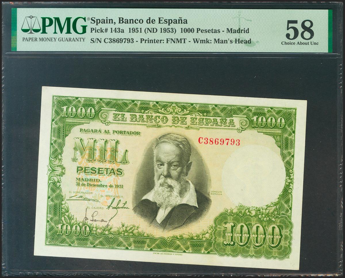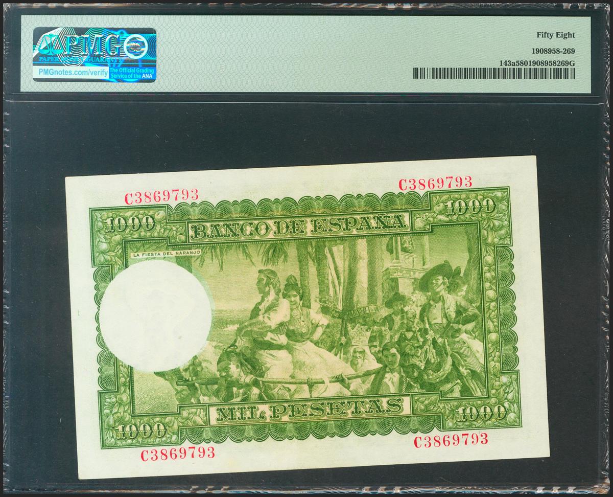 1000 Pesetas. December 31, 1951. Series C, last series issued. (Edifil 2021: 463a, Pick: 143a). EBC++. PMG58 encapsulation.
