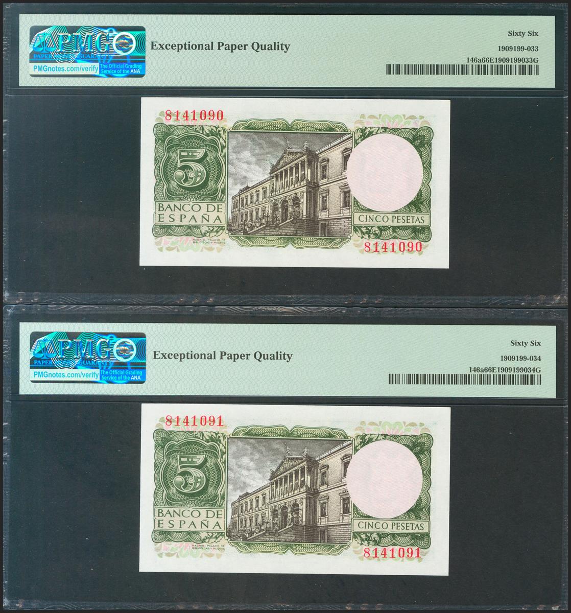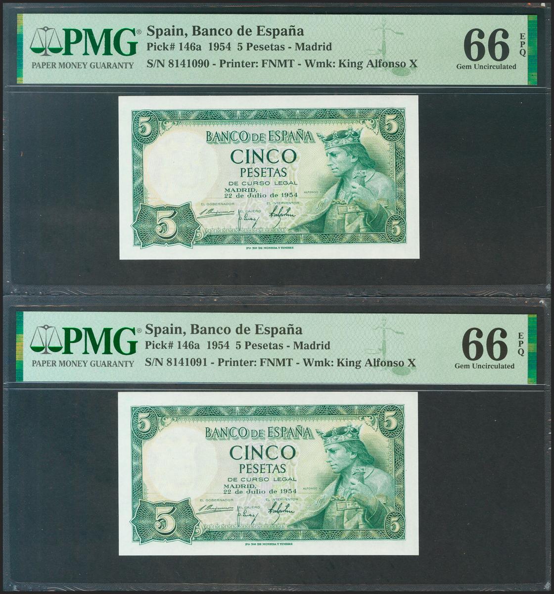 5 pesetas. July 22, 1954. Correlative couple. No serie. (Edifil 2021: 466, Pick: 146a). Rare in this quality, original sizing. Uncirculated. PMG66EPQ package, both.