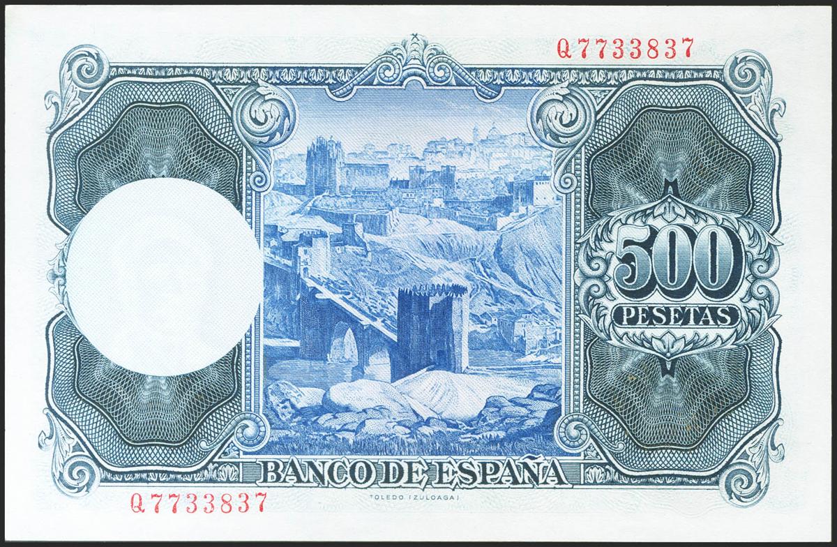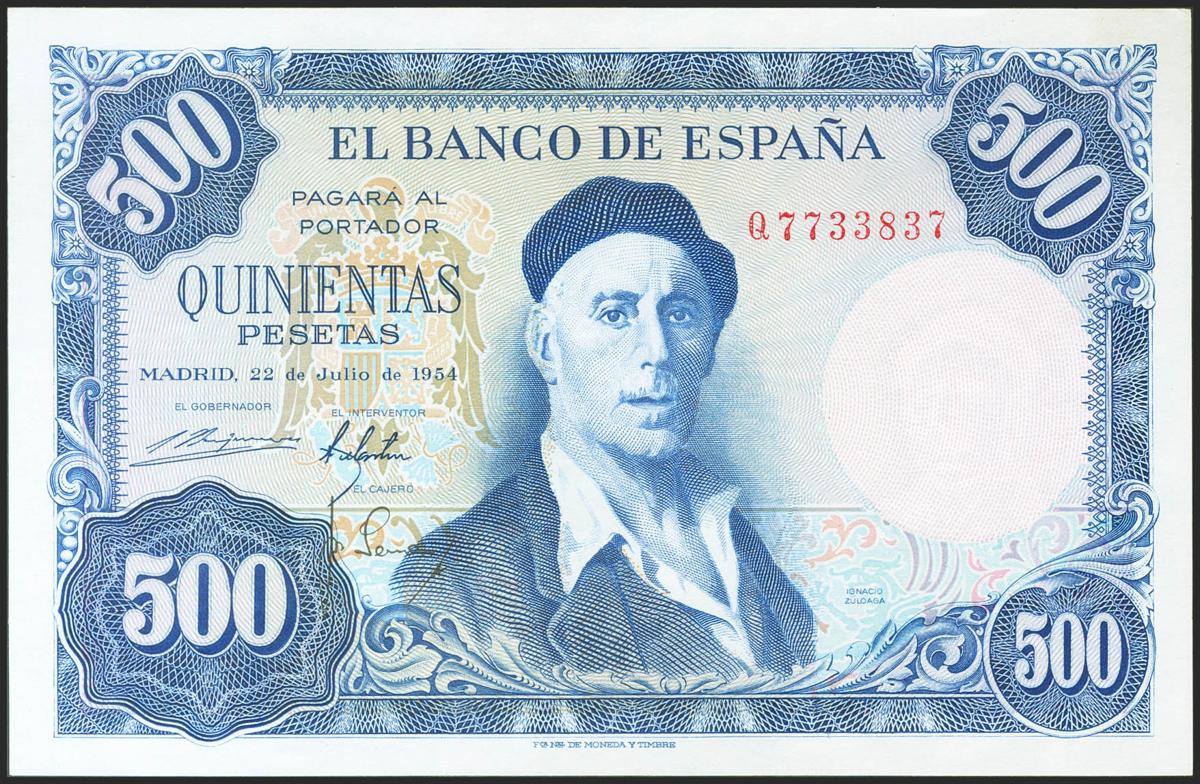 500 pesetas. July 22, 1954. Series Q. (Edifil 2021: 468b). It retains all its original sizing. Uncirculated.