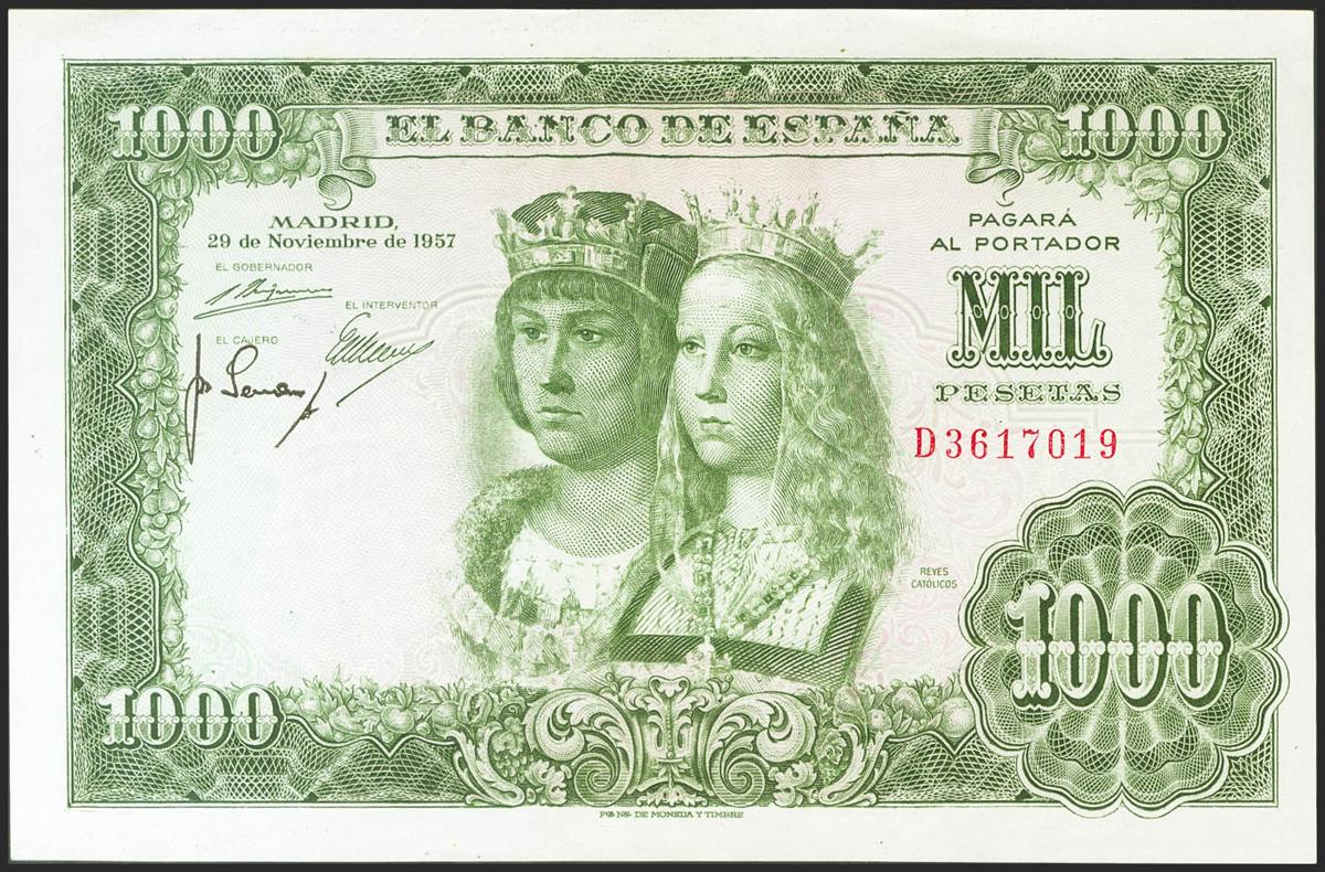 1000 Pesetas. November 29, 1957. Series D. (Edifil 2021: 469b). Retains much of the original sizing. Good Extremely Fine.