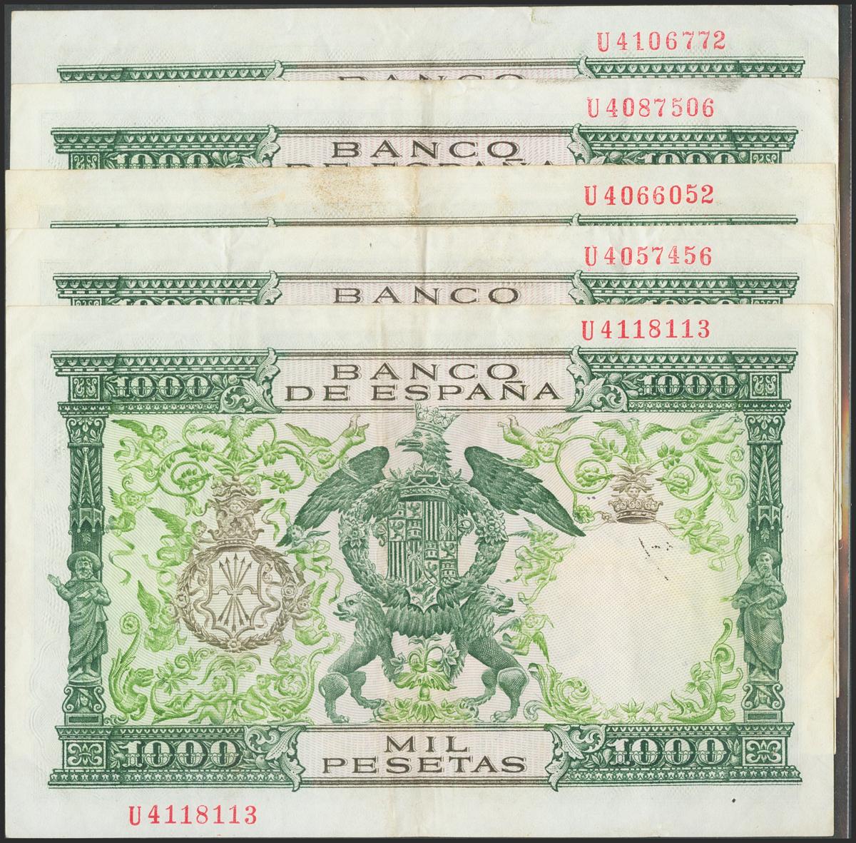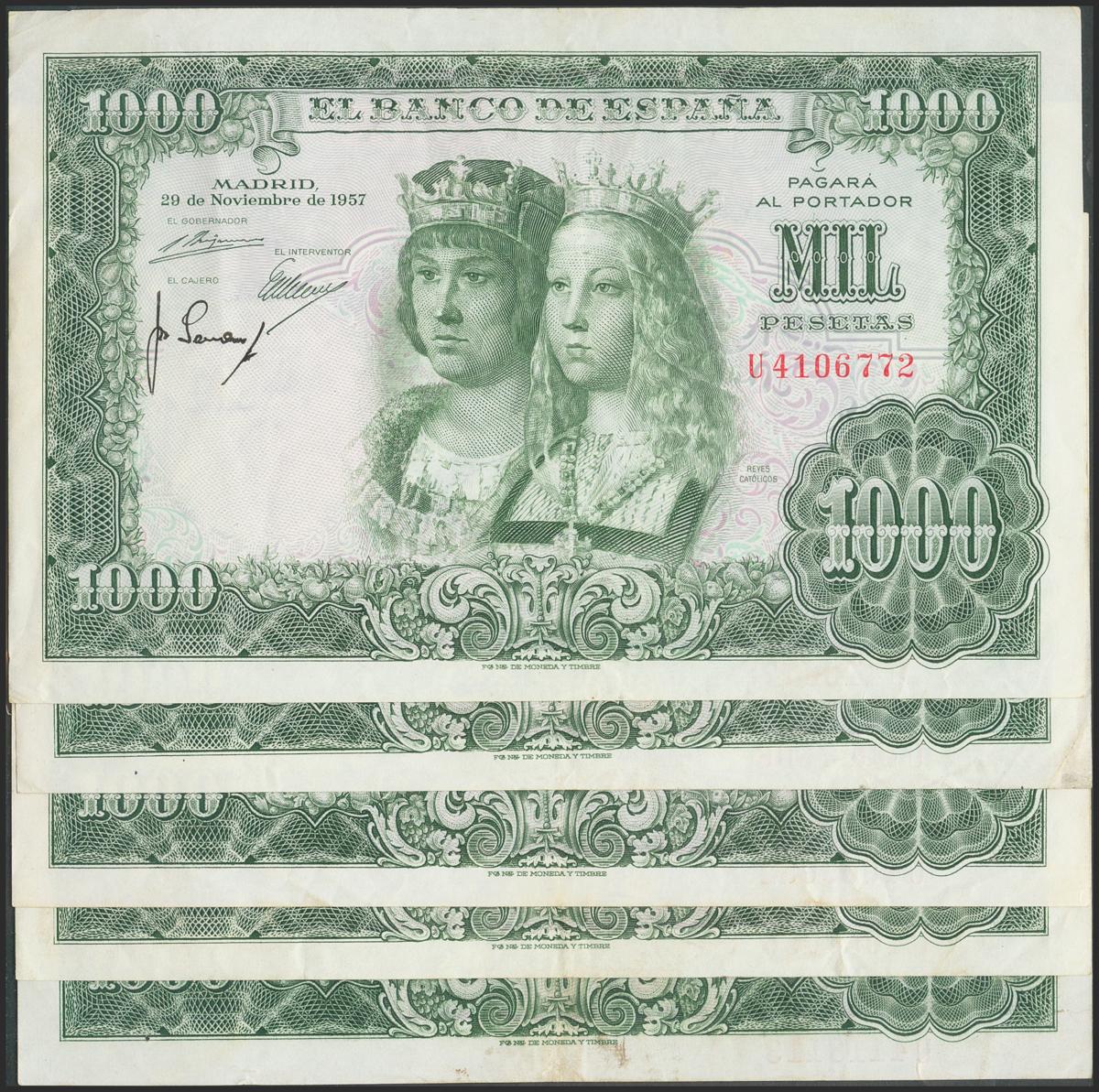 Set of 5 1000 Pesetas bills, issued on November 29, 1957, all with the U series. (Edifil 2017: 469b). Very Fine/ Good Very Fine.