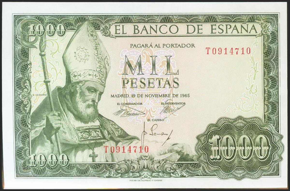 1000 Pesetas. November 19, 1965. Series T. (Edifil 2021: 471b). Original sizing. Uncirculated.