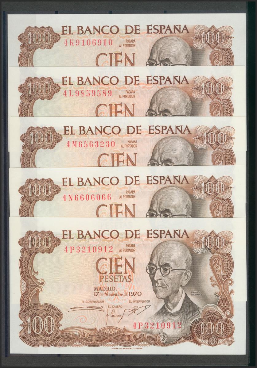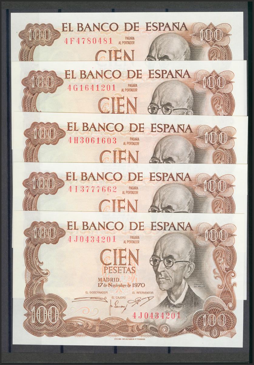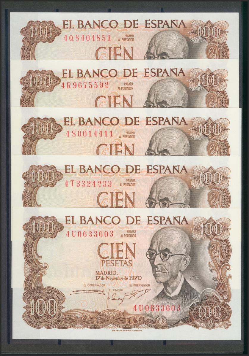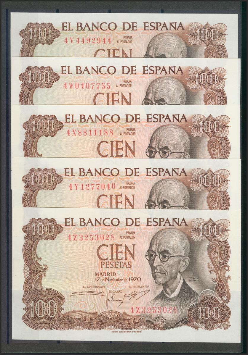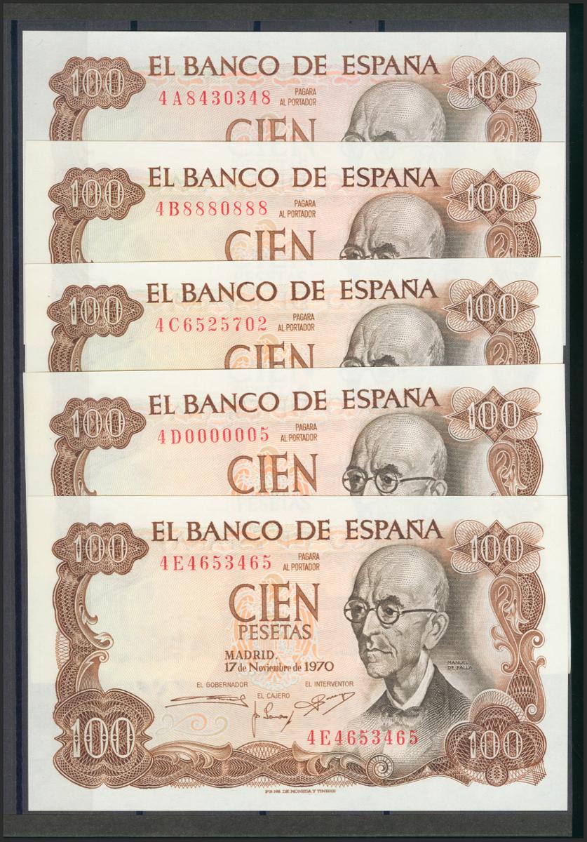 Beautiful and interesting set of 25 100 Pesetas bills issued on November 17, 1970, including all the letters of the fifth issue (4A capicúa, 4B capicúa, 4C, 4D (numbering 4D000005), 4E, 4F, 4G, 4H capicúa, 4I, 4J, 4K, 4L capicua, 4M, 4N capicua, 4P, 4Q, 4R, 4S, 4T capicua, 4U, 4V capicua, 4W, 4X capicua, 4Y and 4Z). (Edifil 2017: 472c). Rare set and of very good quality, all the banknotes have original sizing (the set must be considered for all purposes of the highest quality, especially in such a set, it is possible that there may be one at most two Almost Uncirculated -quality banknotes - and not so even that but we prefer to opt for prudence, in our opinion it is something absolutely despicable). Uncirculated/ Almost Uncirculated.