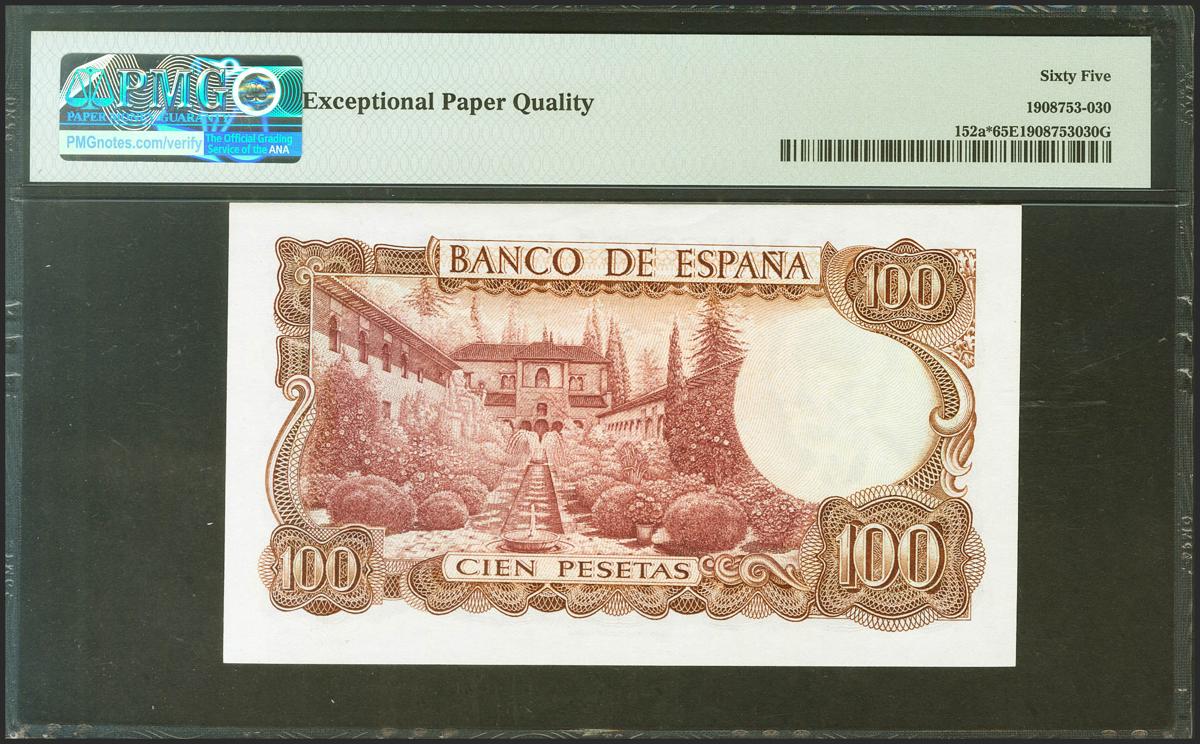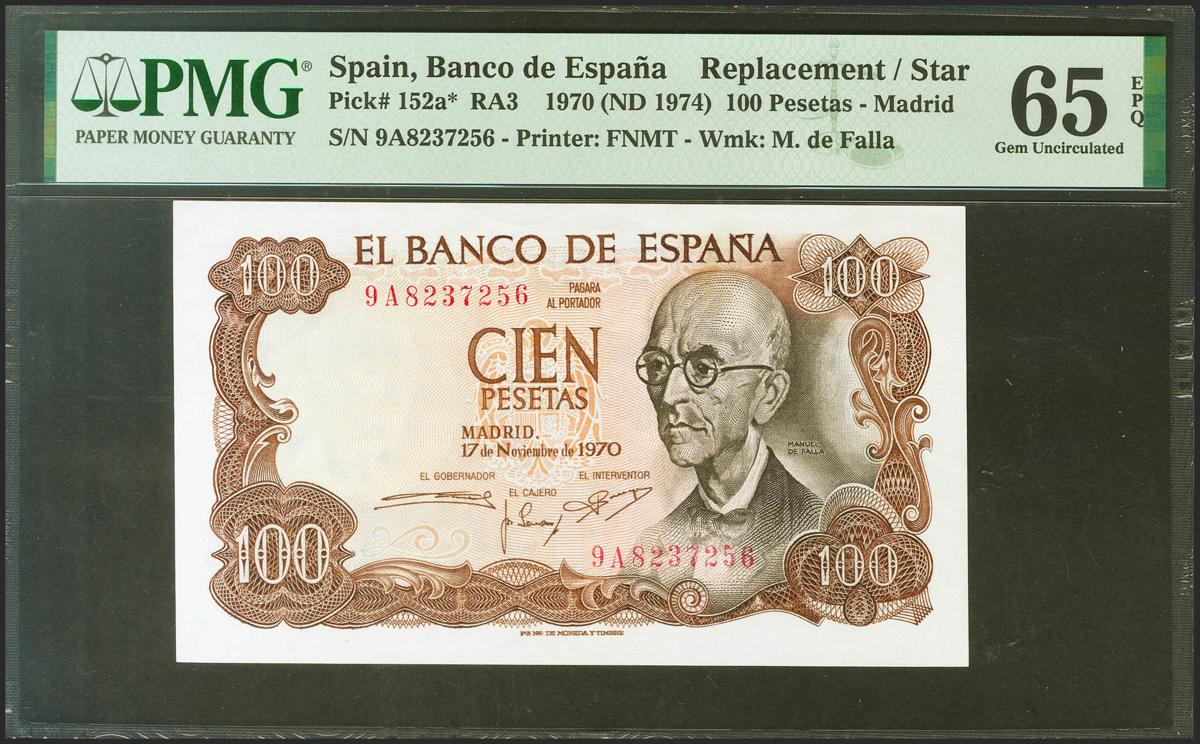 100 pesetas. November 17, 1970. Special series 9A. (Edifil 2021: 472d, Pick: 152a*). Uncirculated. PMG65EPQ package.