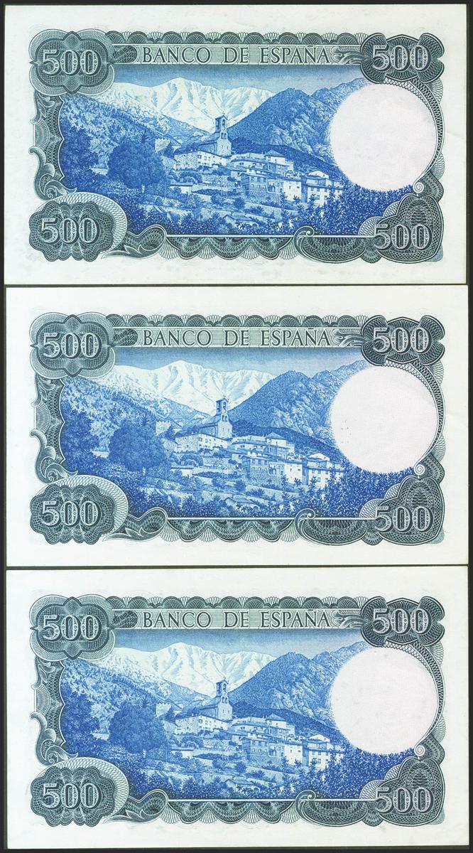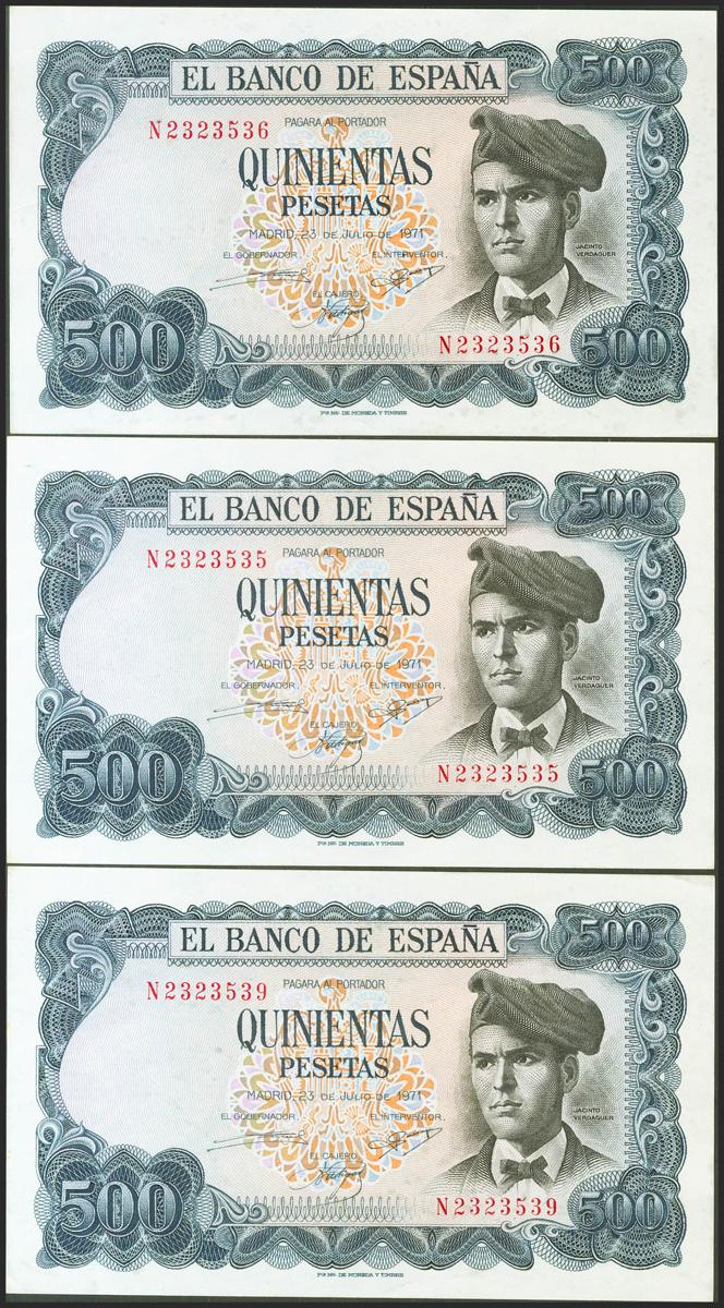 Set of 3 500 Pesetas bills issued on July 23, 1971 with series N made up of a correlative pair and a closely numbered bill (Edifil 2021: 473a). Almost Uncirculated-.
