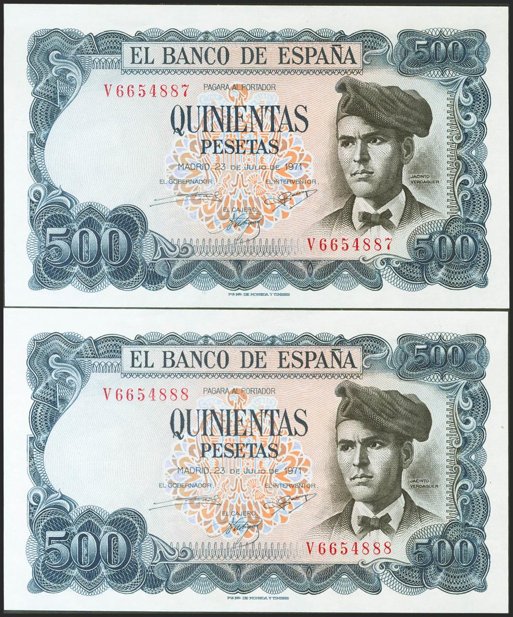 English 500 pesetas. July 23, 1971. Correlative couple. Series V. (Edifil 2021: 473a). It retains all its original sizing. Almost Uncirculated.