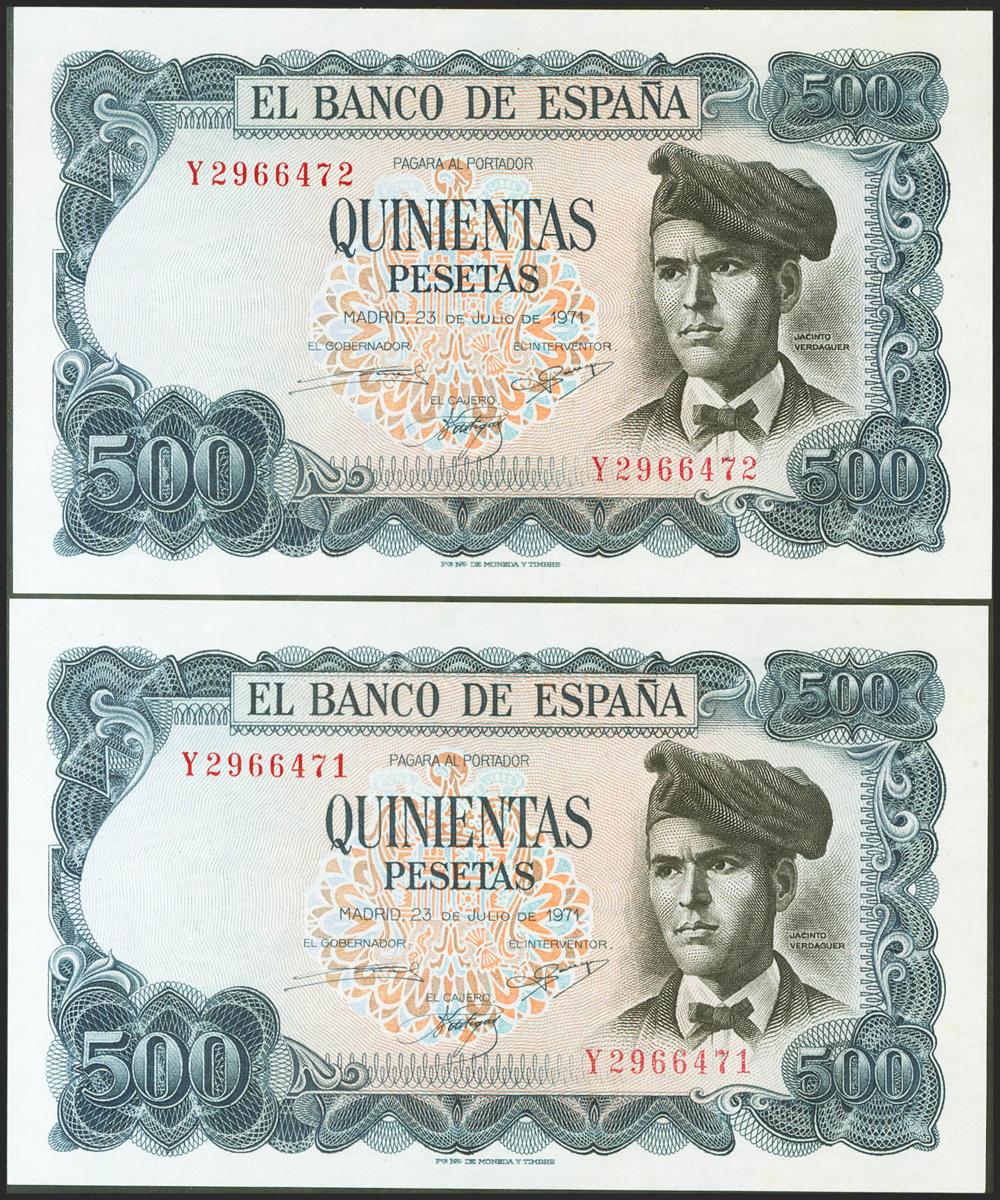 500 pesetas. July 23, 1971. Correlative couple. Series Y. (Edifil 2021: 473a). It retains all its original sizing. Uncirculated.