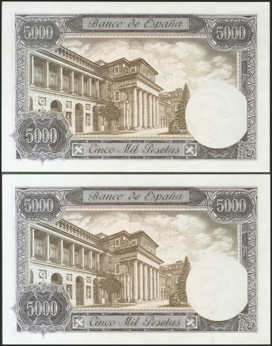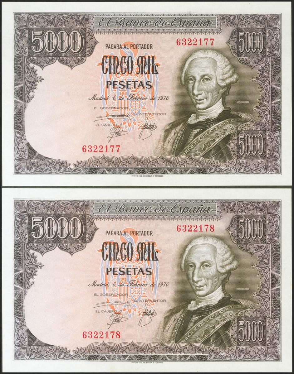 5000 Pesetas. February 6, 1976. Correlative couple. No serie. (Edifil 2021: 475). Almost Uncirculated.