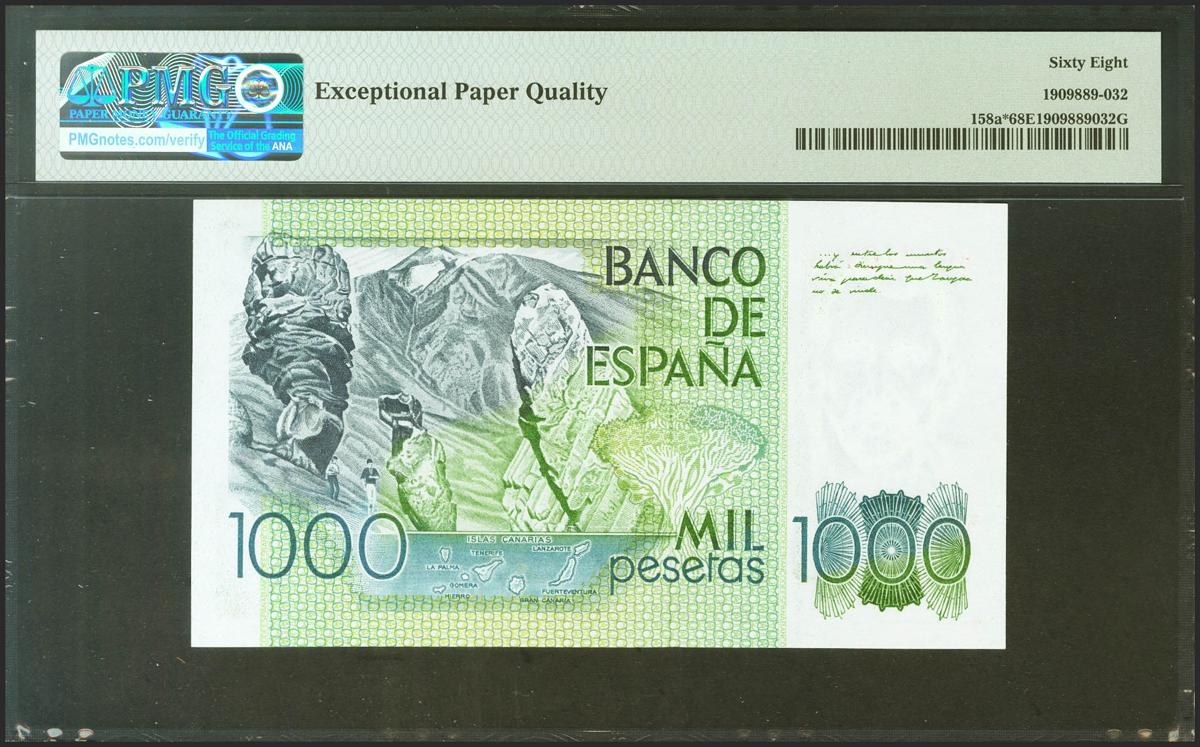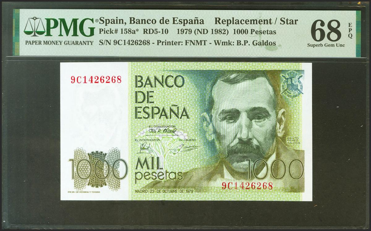 1000 Pesetas. October 23, 1979. Special series 9C. (Edifil 2021: 477b, Pick: 158a*). Extraordinarily rare in this exceptional quality, original sizing. Uncirculated. PMG68EPQ package. (to get an idea of its rarity, as of April 1, 2022 in the public registry of PMG, this banknote is best preserved together with another banknote)
