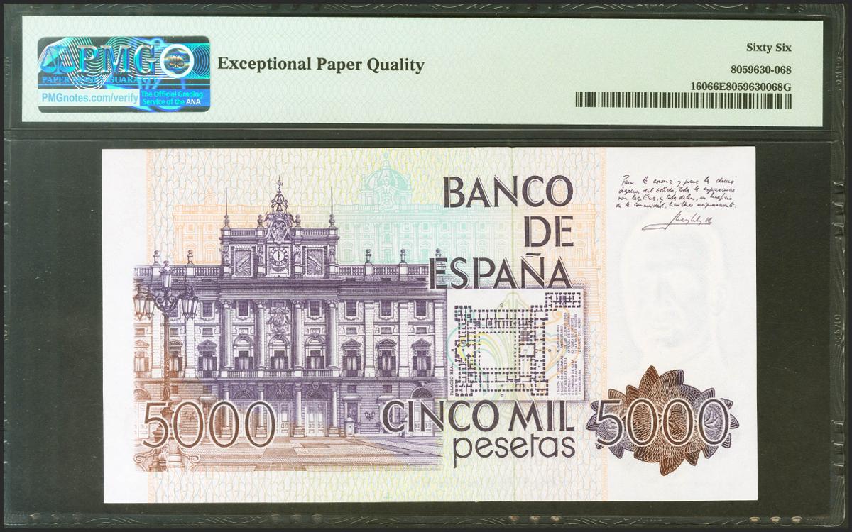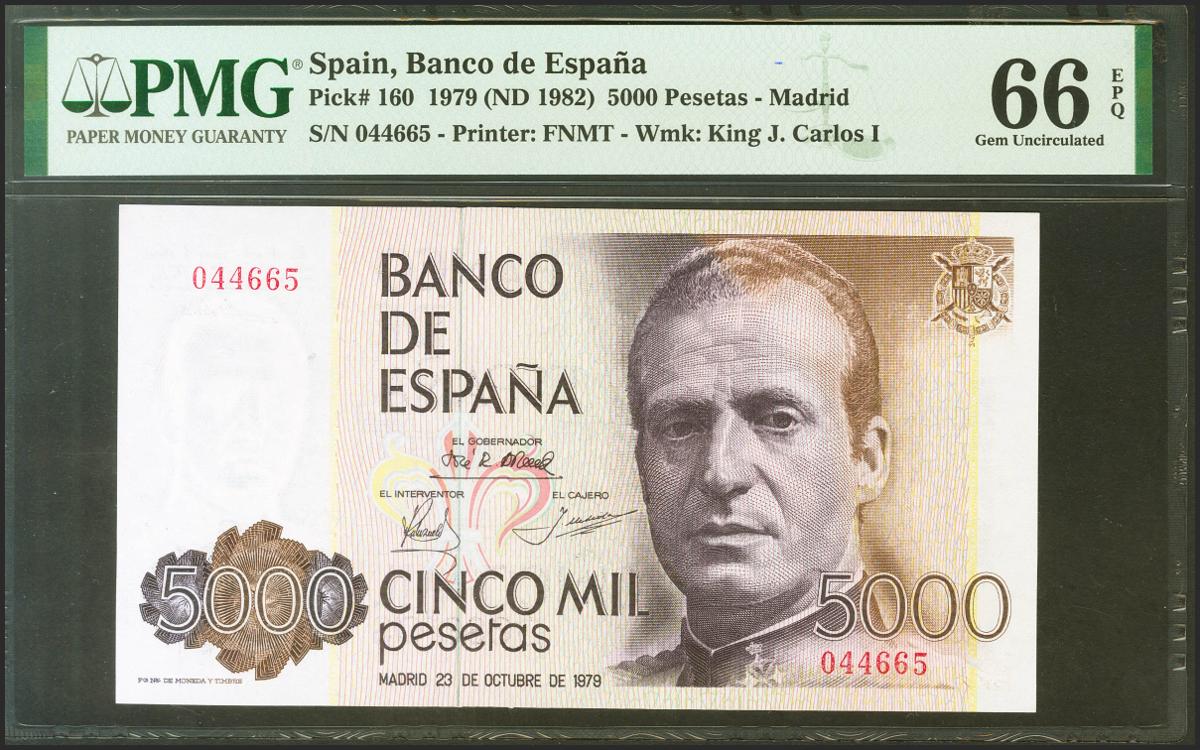 5000 Pesetas. October 23, 1979. No series. (Edifil 2021: 478, Pick: 160). Original sizing. PMG66EPQ package.