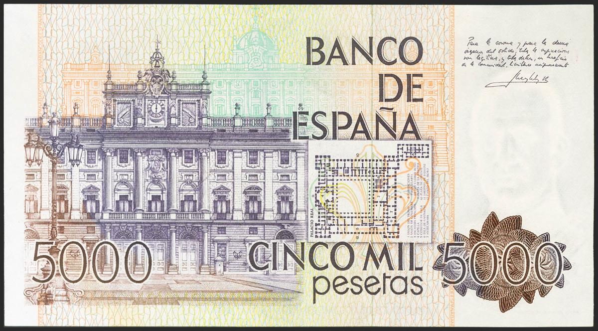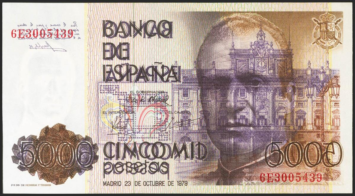 English 5000 Pesetas. October 23, 1979. Series E. Printing failure of the reverse on the obverse. (Edifil 2021: 478a). Almost Uncirculated.