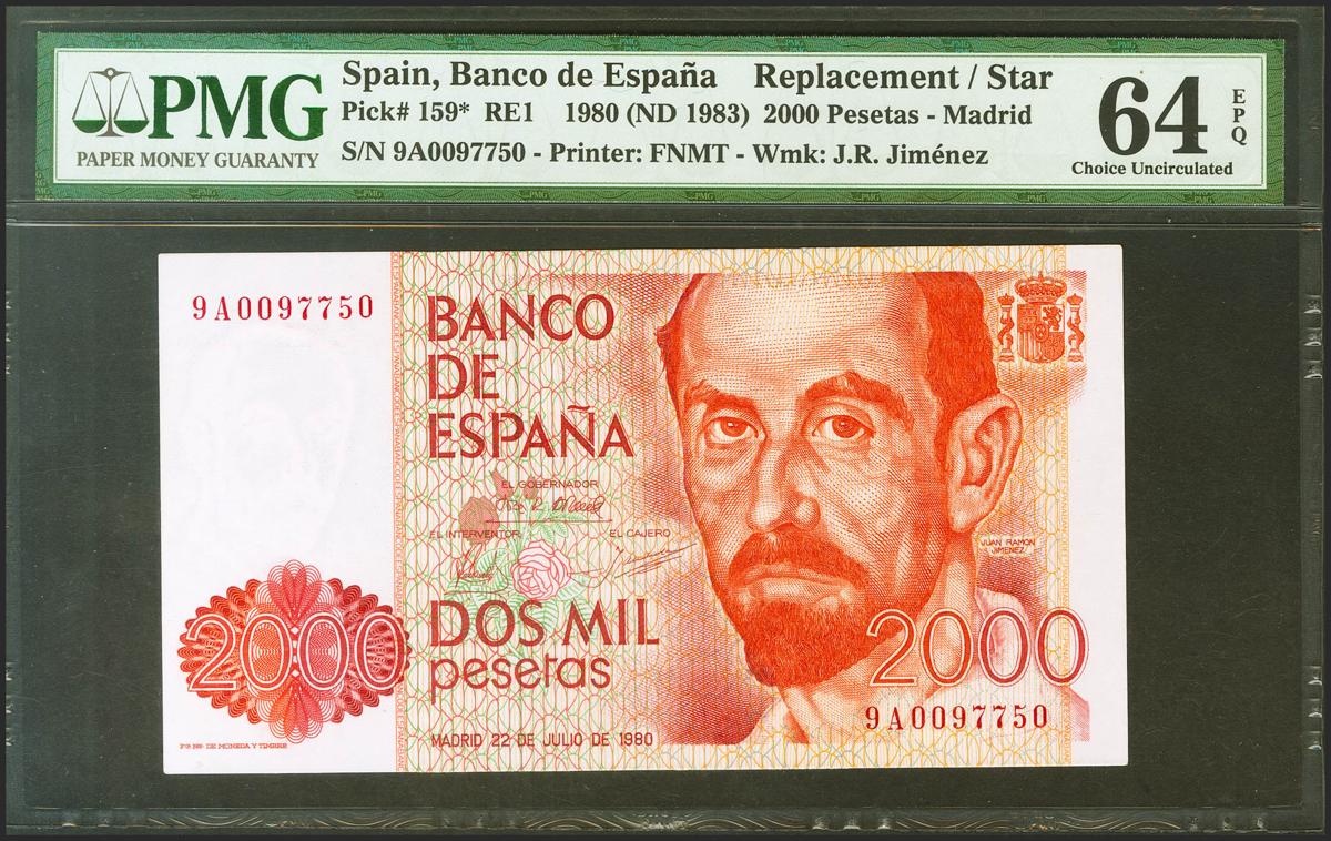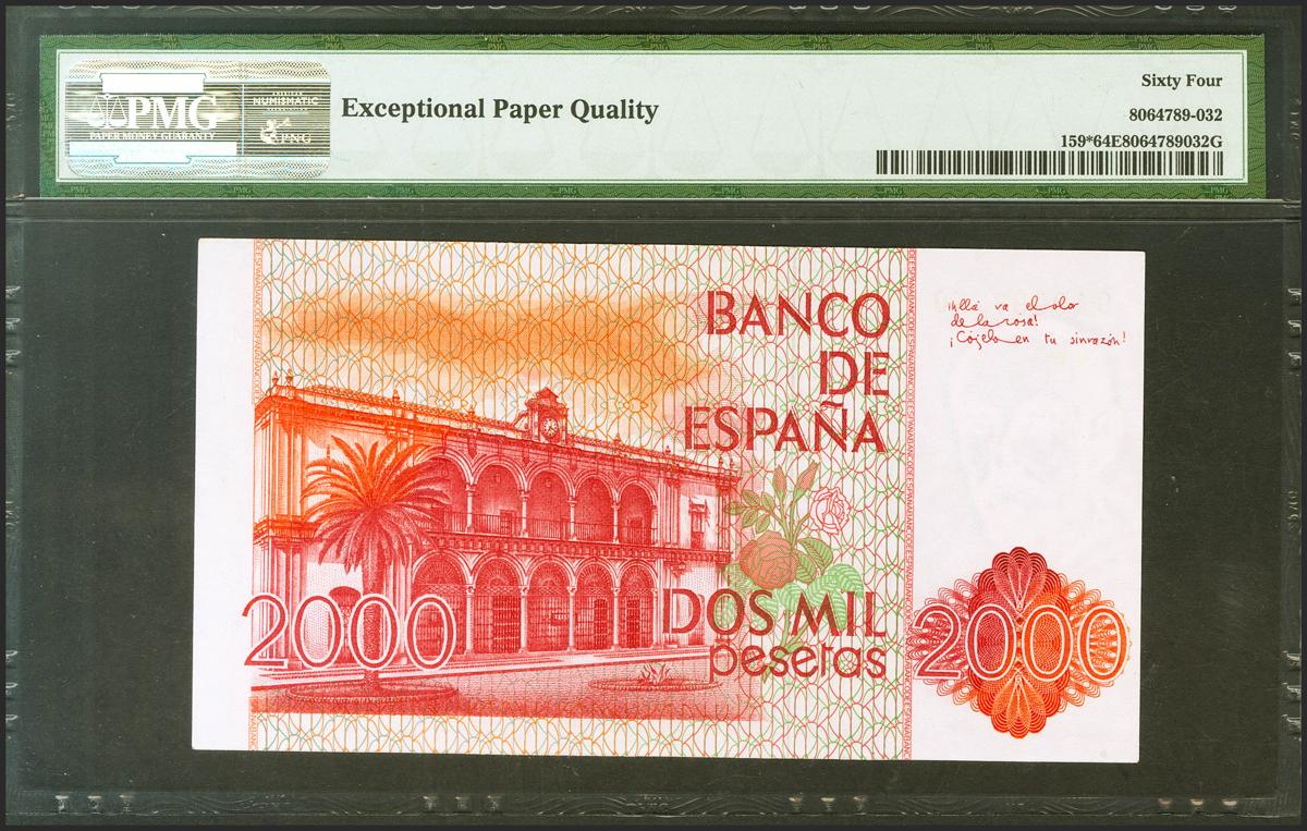 2000 Pesetas. July 22, 1980. Special series 9A. (Edifil 2021: 479b, Pick: 159*). Original sizing. Uncirculated. PMG64EPQ package.