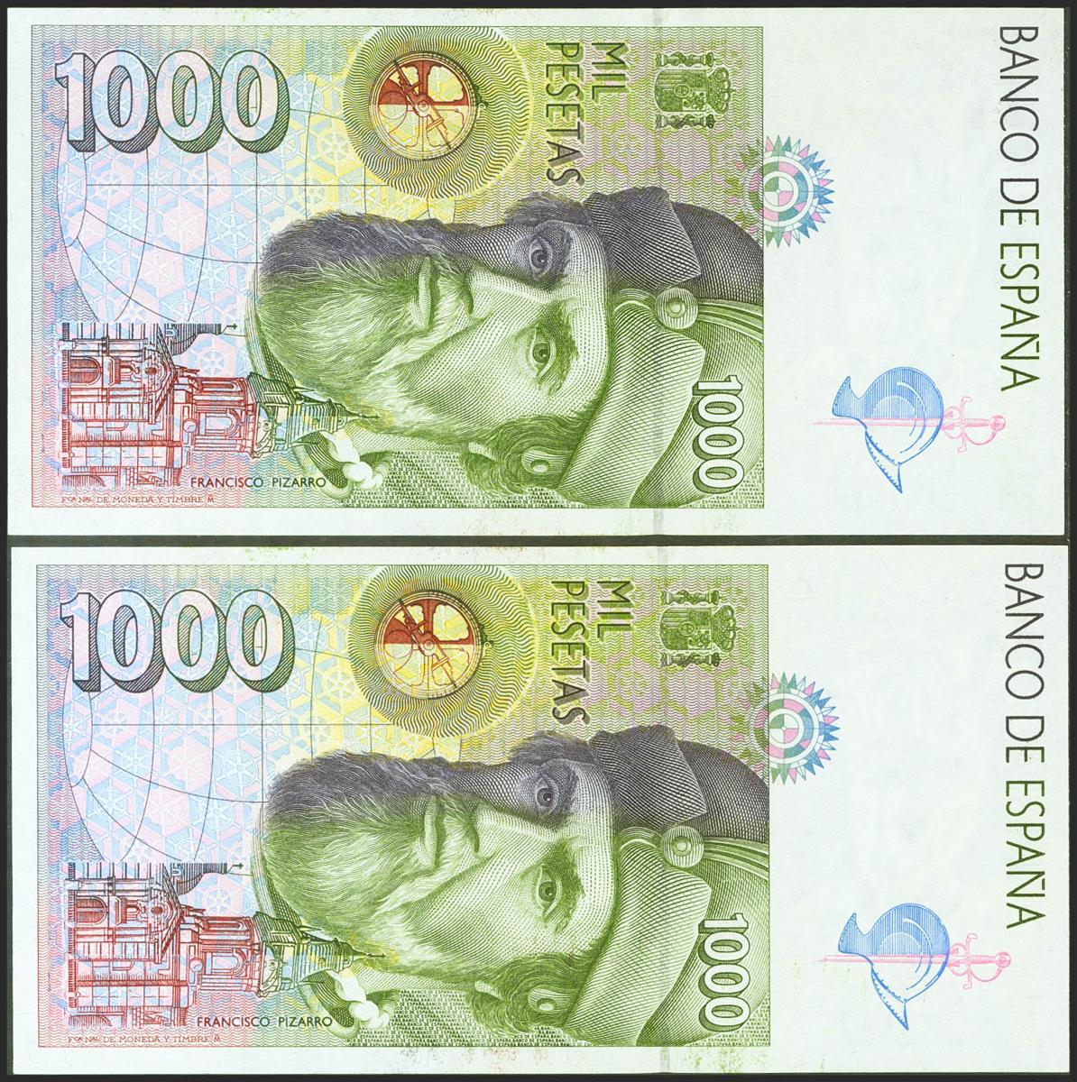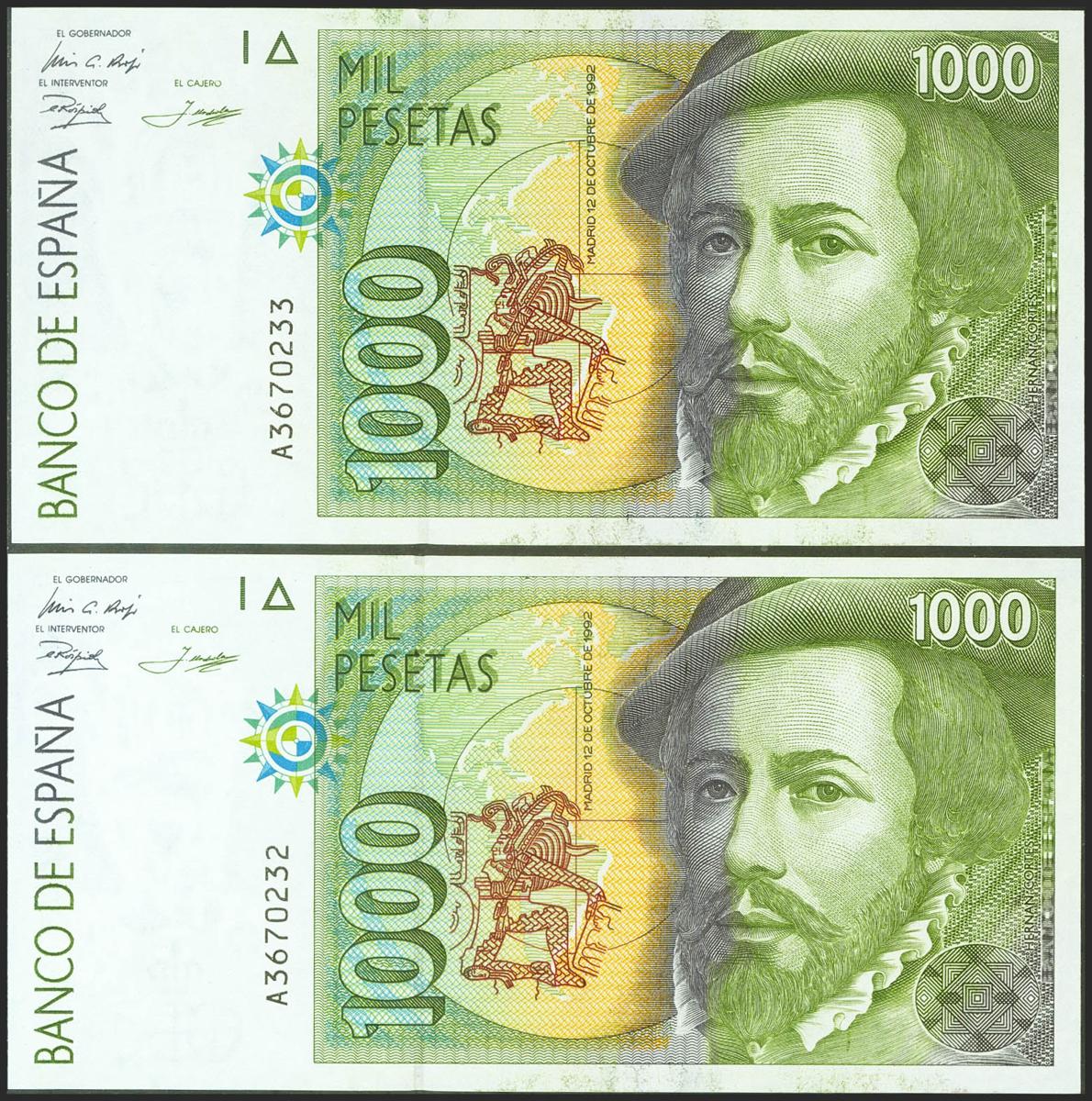 1000 Pesetas. October 12, 1992. Correlative couple. Series A. (Edifil 2021: 483a). Uncirculated.