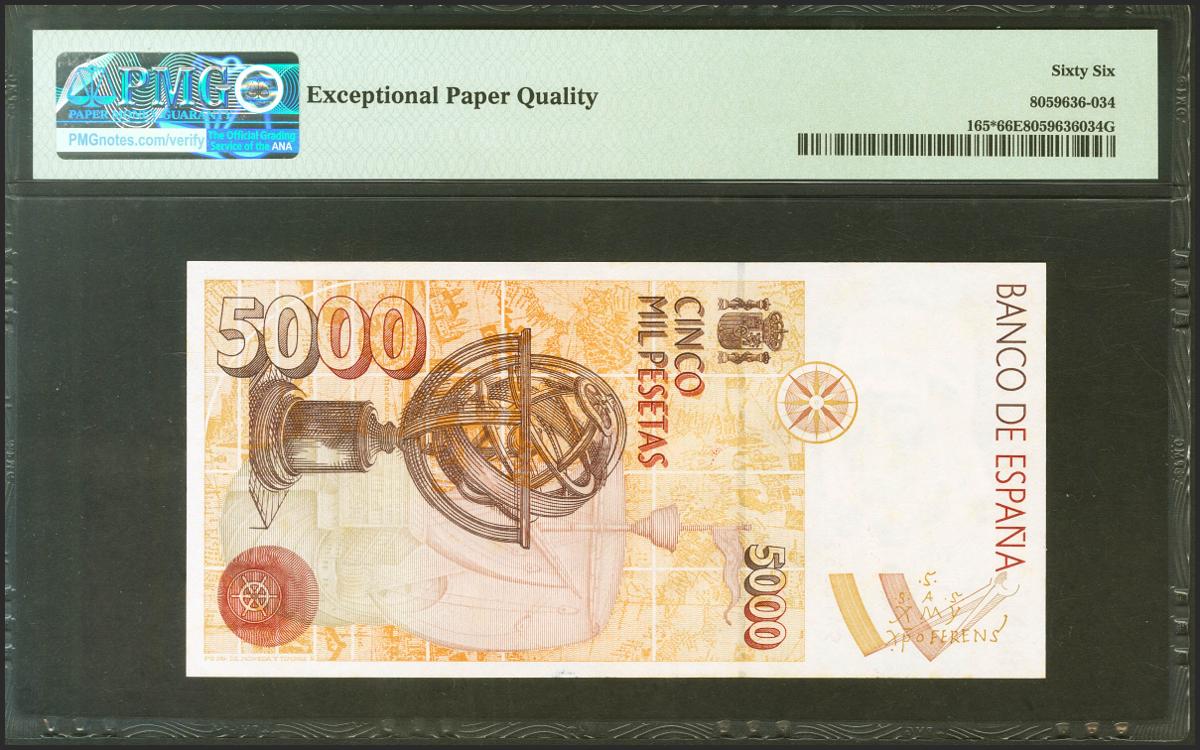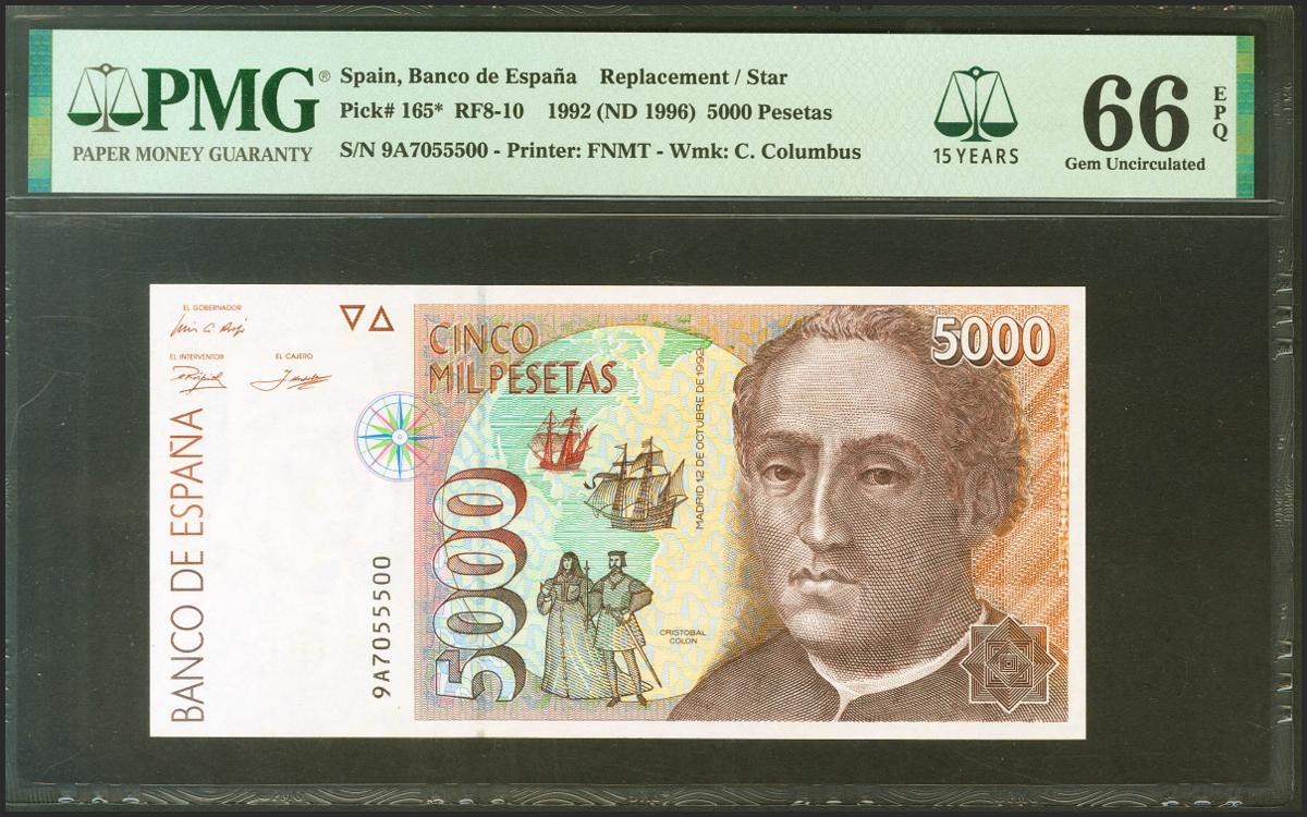 5000 Pesetas. October 12, 1992. Special series 9C. (Edifil 2021: 484b, Pick: 165*). Original sizing. Uncirculated. PMG66EPQ package.