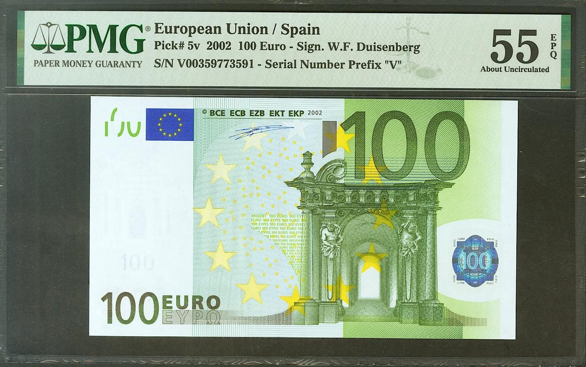 100 euros. January 1, 2002. Signature Duisenberg. Series V (Spain). (Edifil 2017: 490). Good Extremely Fine. PMG55EPQ.