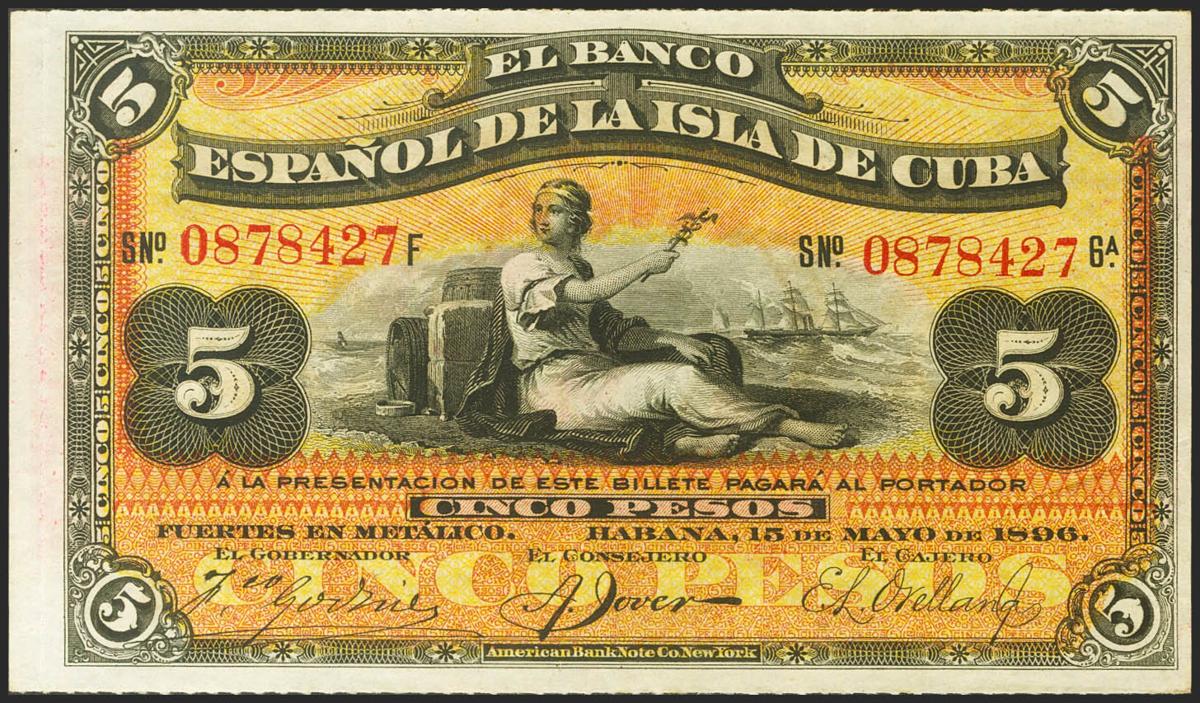 SPANISH BANK OF THE ISLAND OF CUBA. 5 Pesos. May 15, 1896. SILVER surcharge, on the reverse. (Edifil 2021: 81). Rare, original sizing. Almost Uncirculated.