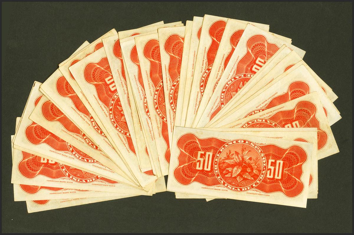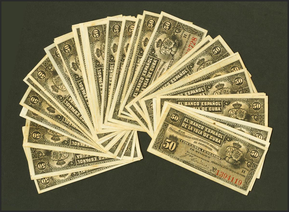 Set of 35 50 Centavos bills issued by the Spanish Bank on the Island of Cuba on May 15, 1896 with the H series (Edifil 2021: 70), retain their original size and most with very acceptable conservation. Almost Uncirculated/ Extremely Fine. TO EXAMINE.