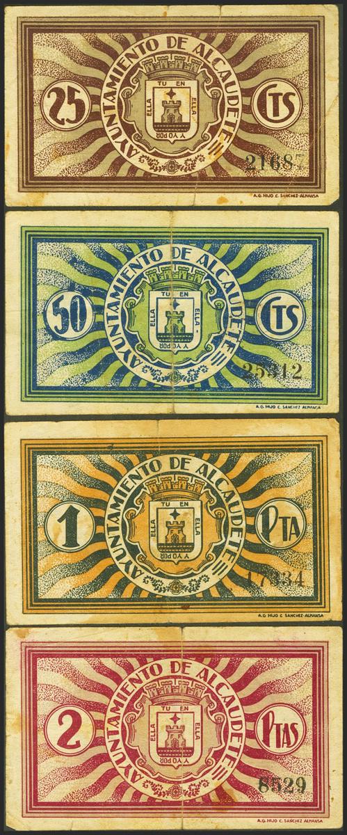 ALCAUDETE (JAEN). 25 Cents, 50 Cents, 1 Peseta and 2 Pesetas. (1937ca). (González: 310/13). Rare complete series. Fine/ Almost Fine.