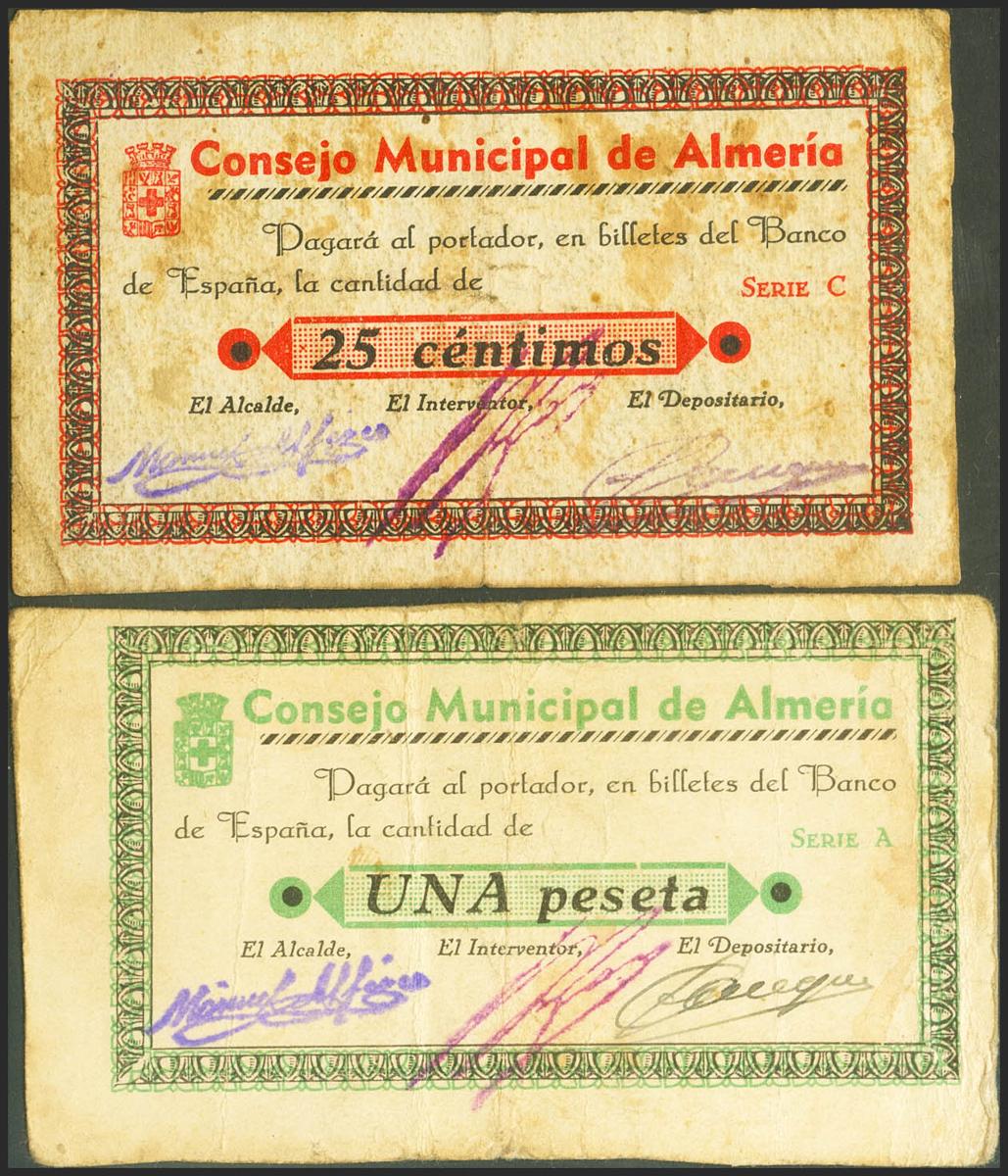 ALMERIA. 25 Cents and 1 Peseta. (1937ca). Series C and A, respectively. (Gonzalez: 573, 575). Very Fine/ Fine.